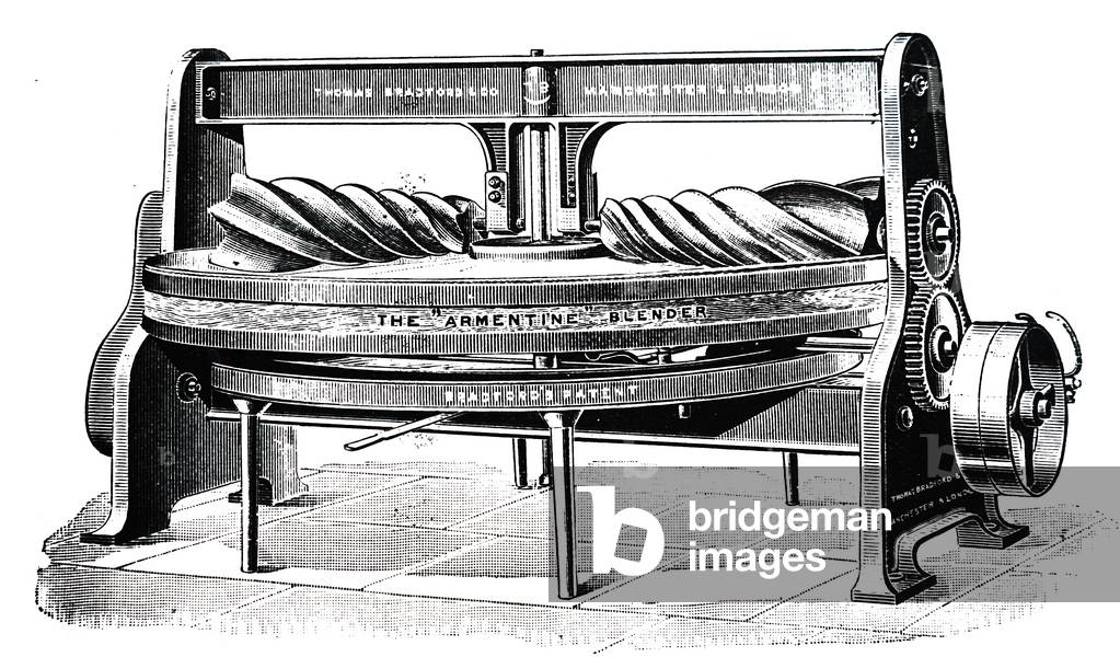 UIG3732528 Engraving depicting a butter working and blending machine in which excess buttermilk was removed and salt blended in. Butter would be placed on the circular revolving table and passed repeatedly under fluted rollers. As the butter would be blended, the buttermilk drained out and was collected in a bucket placed under the table. Dated 19th Century.
