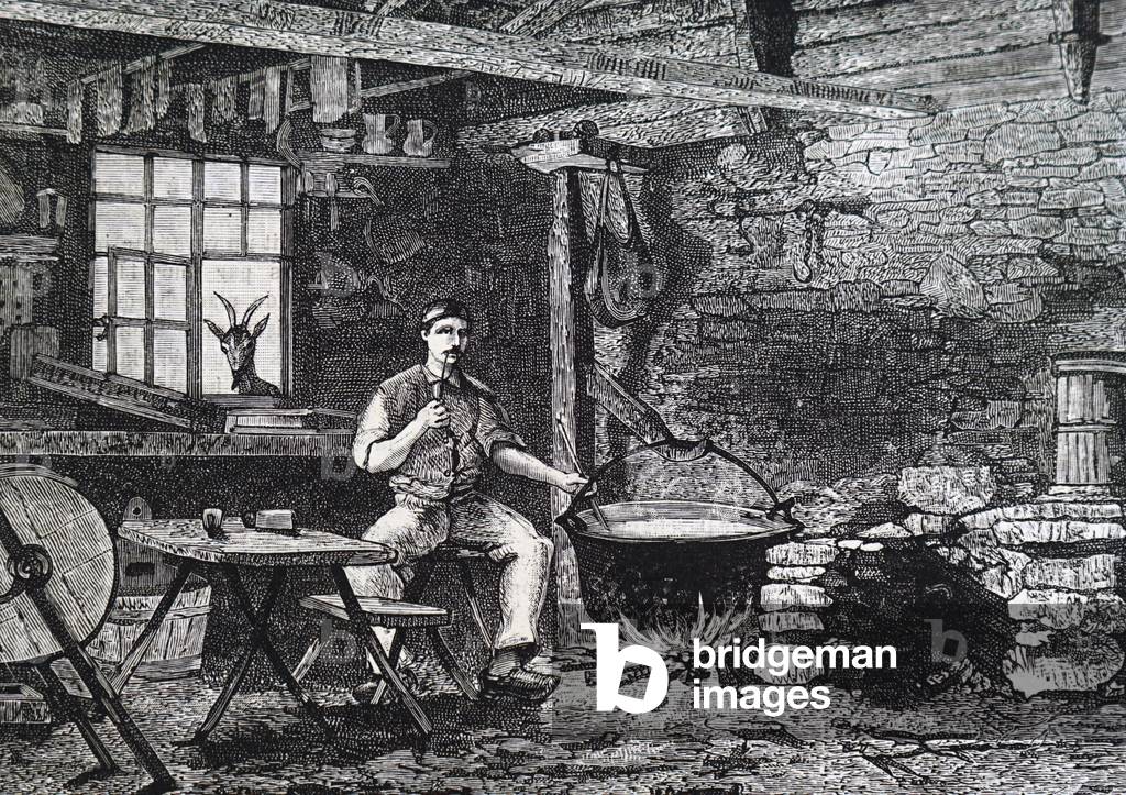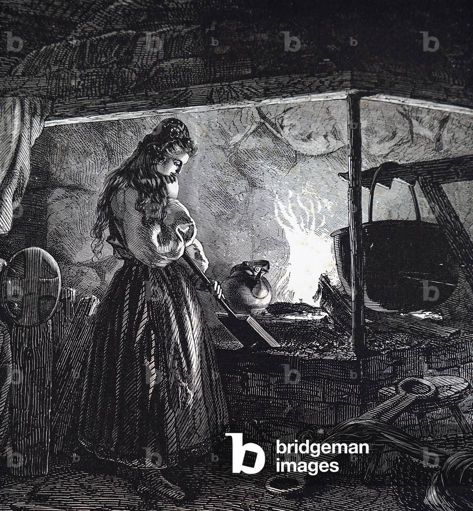 UIG3732843 Engraving depicting a young girl heating Gamalost, which translates as 'old cheese', which was a pungent traditional Norwegian cheese. Dated 19th Century.