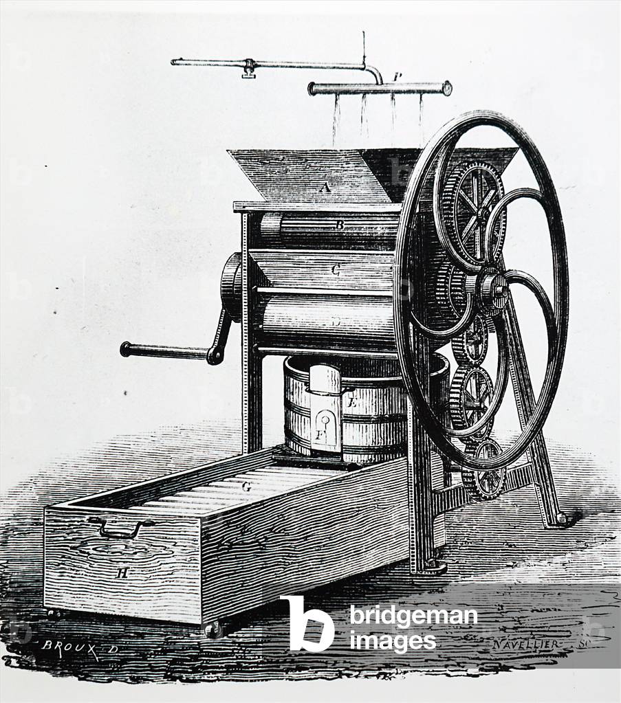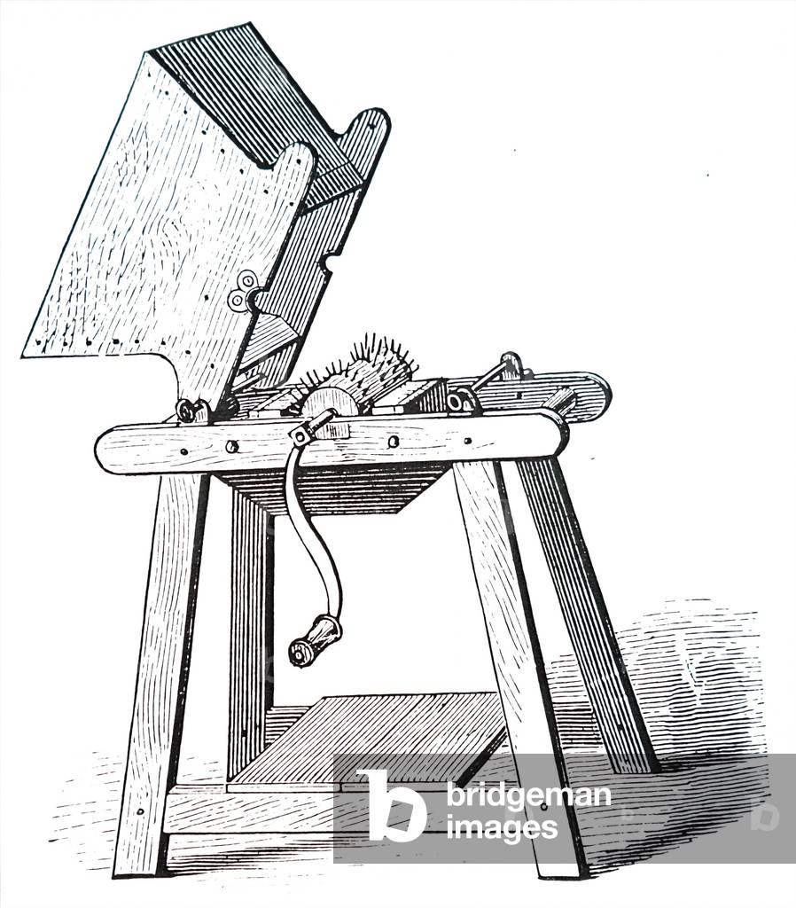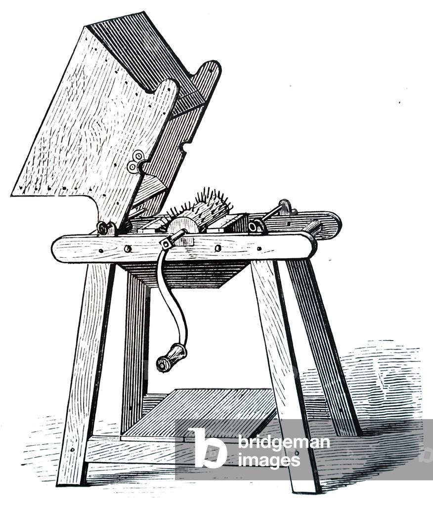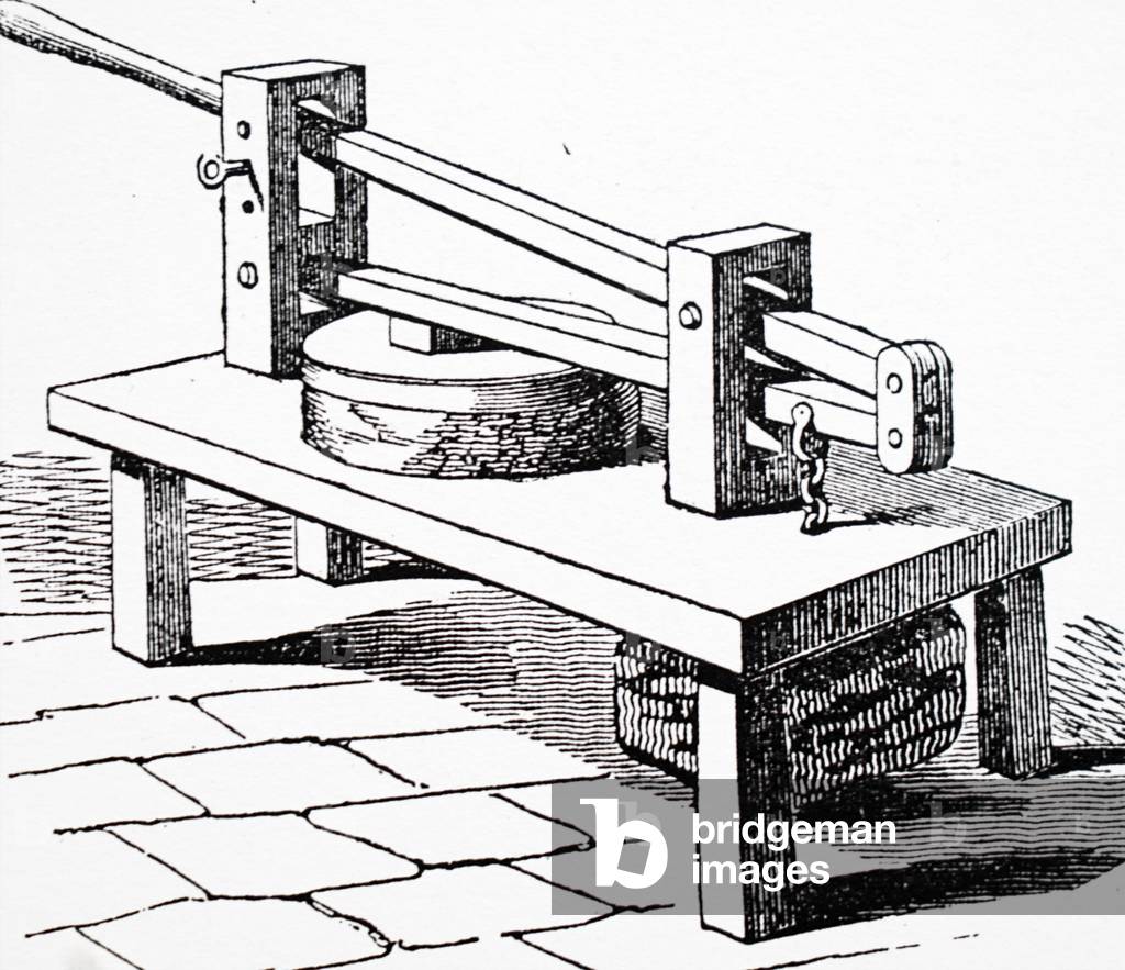 UIG3732604 Engraving depicting a curd mill for grinding the curd before placing it with salt in a cheese vat, used in the manufacturing Cheshire cheese. Dated 19th Century.