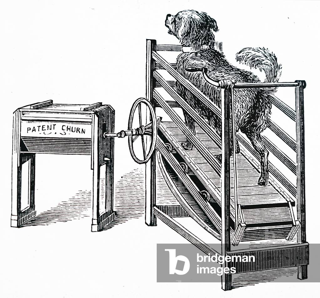 UIG3732834 Engraving depicting a butter churn powered by a dog running on a treadmill. Dated 19th Century.
