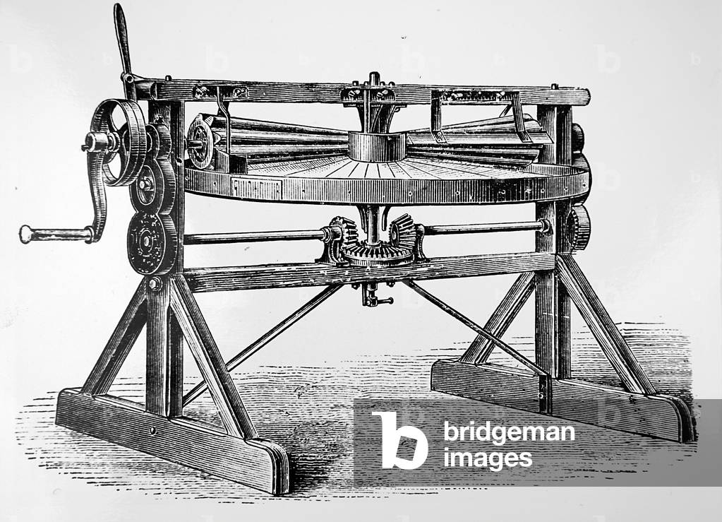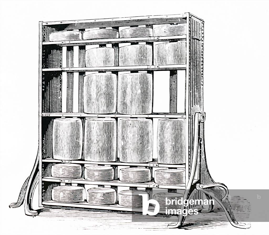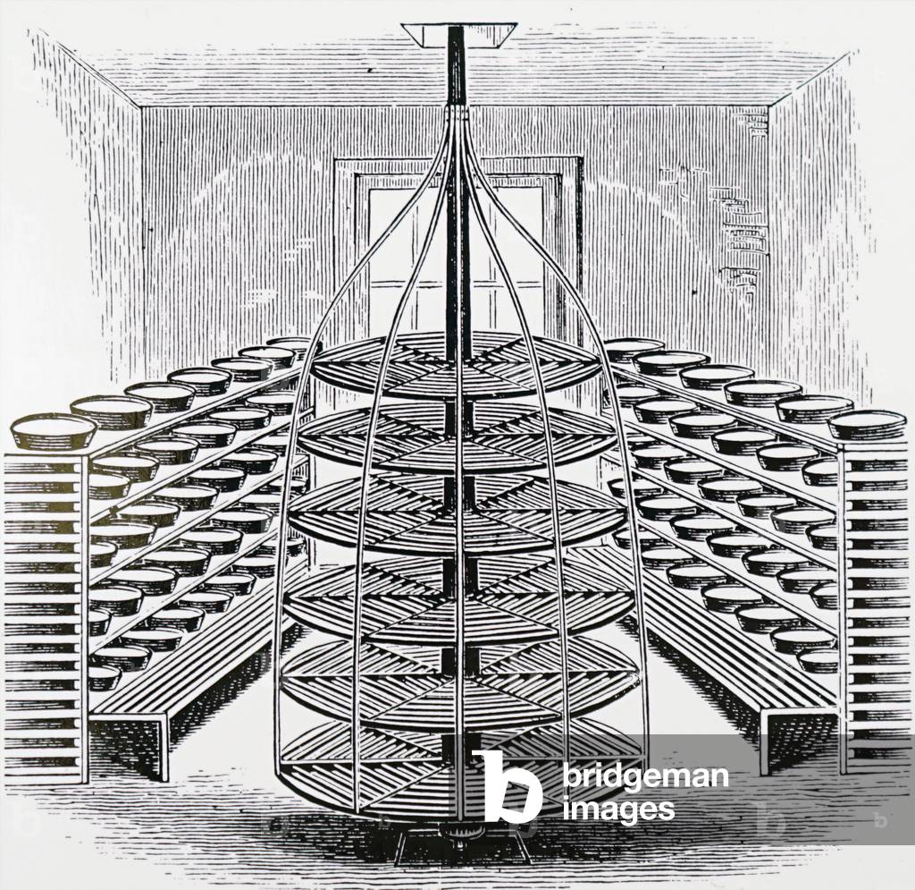 UIG3732544 Engraving depicting a revolving cheese rack for maturing cheeses. Dated 19th Century.