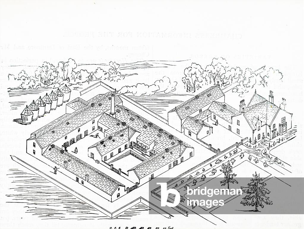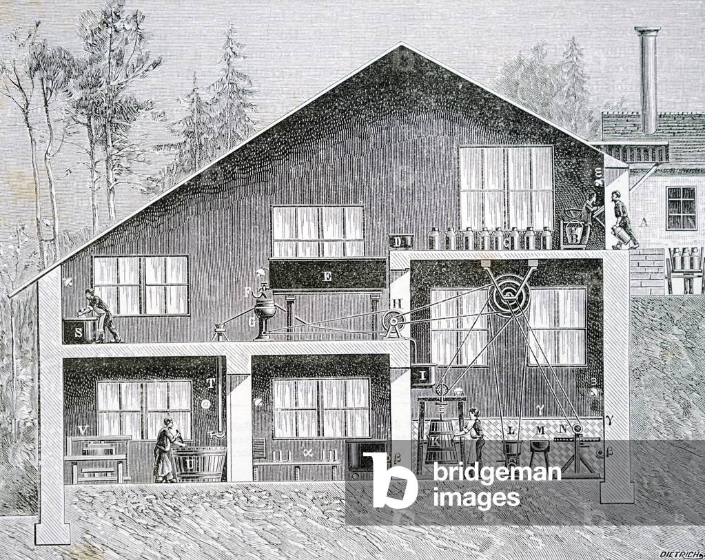 UIG3732514 Engraving depicting an industrialised milk parlour and refinery at Roche-sur-Loue, near d'Arc-et-Senans, Besancon, France. Dated 19th Century.