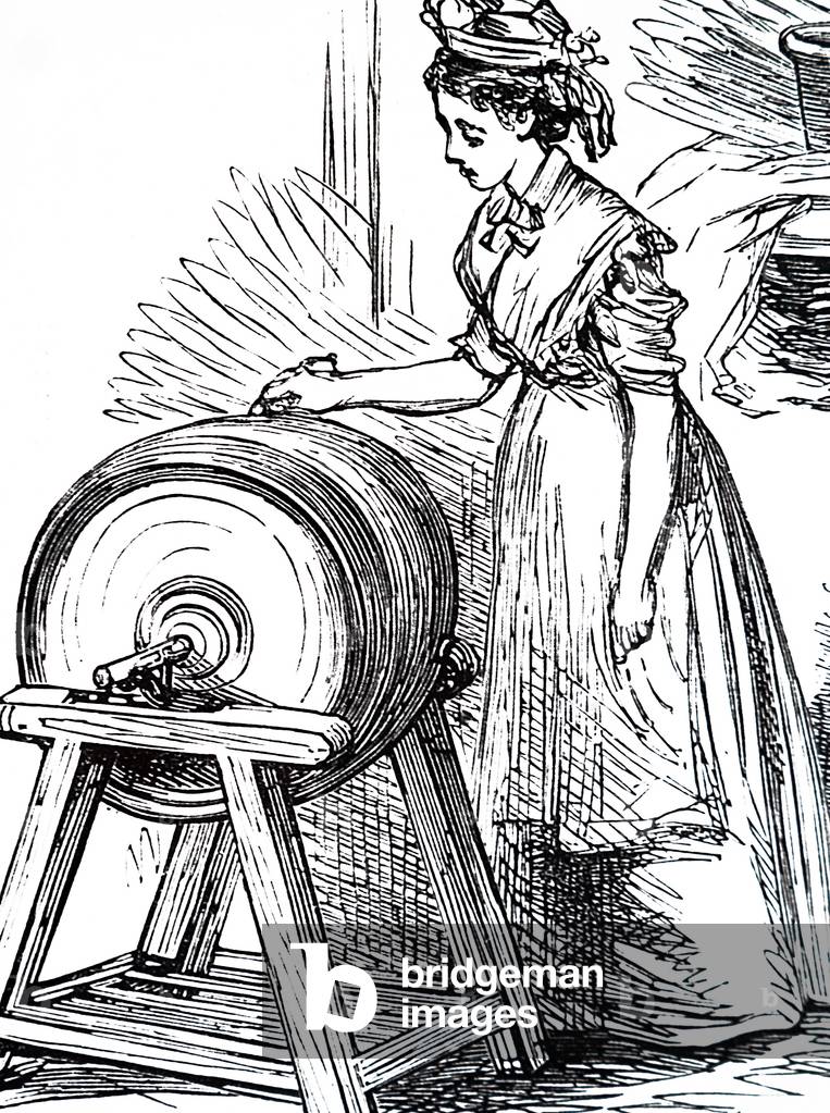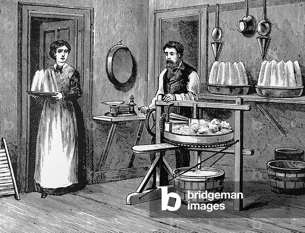 UIG3732530 Engraving depicting the use of a hand-powered butter working machine in which excess buttermilk was removed and salt blended in. Butter would be placed on a revolving circular table and passed repeatedly under a fluted roller. The buttermilk drained into the bucket under the table. Dated 19th Century.