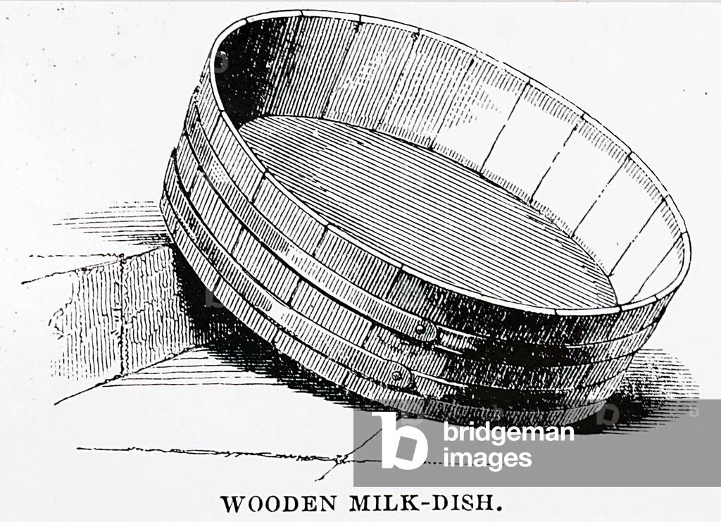 UIG3732526 Engraving depicting a wooden milk dish in which the cream was allowed to rise. Dated 19th Century.