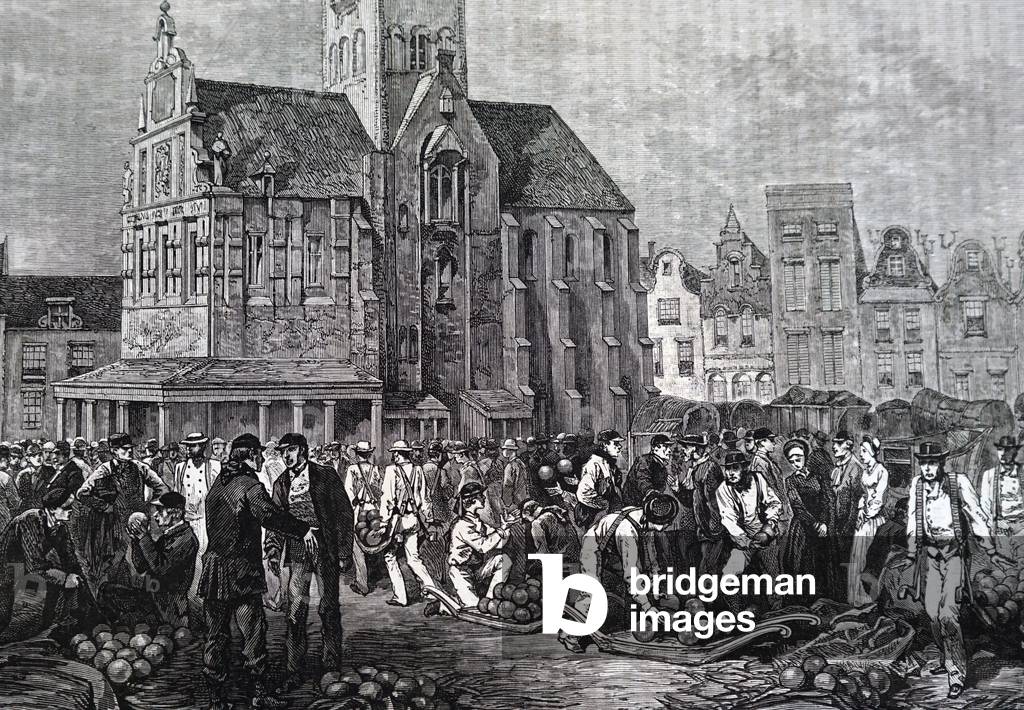UIG3732838 Engraving depicting a cheese market in Alkmaar, Netherlands. Dated 19th Century.