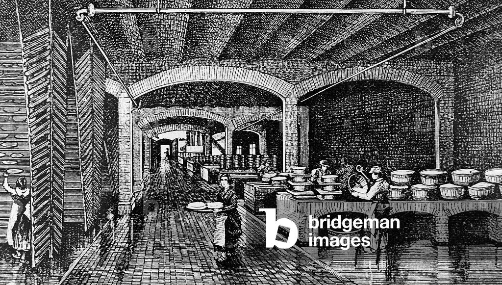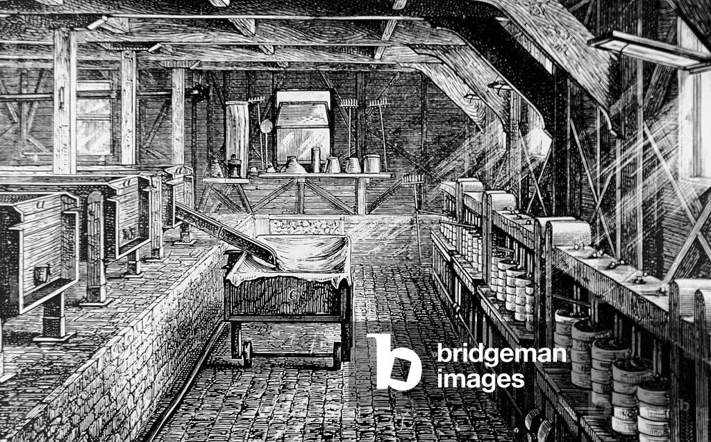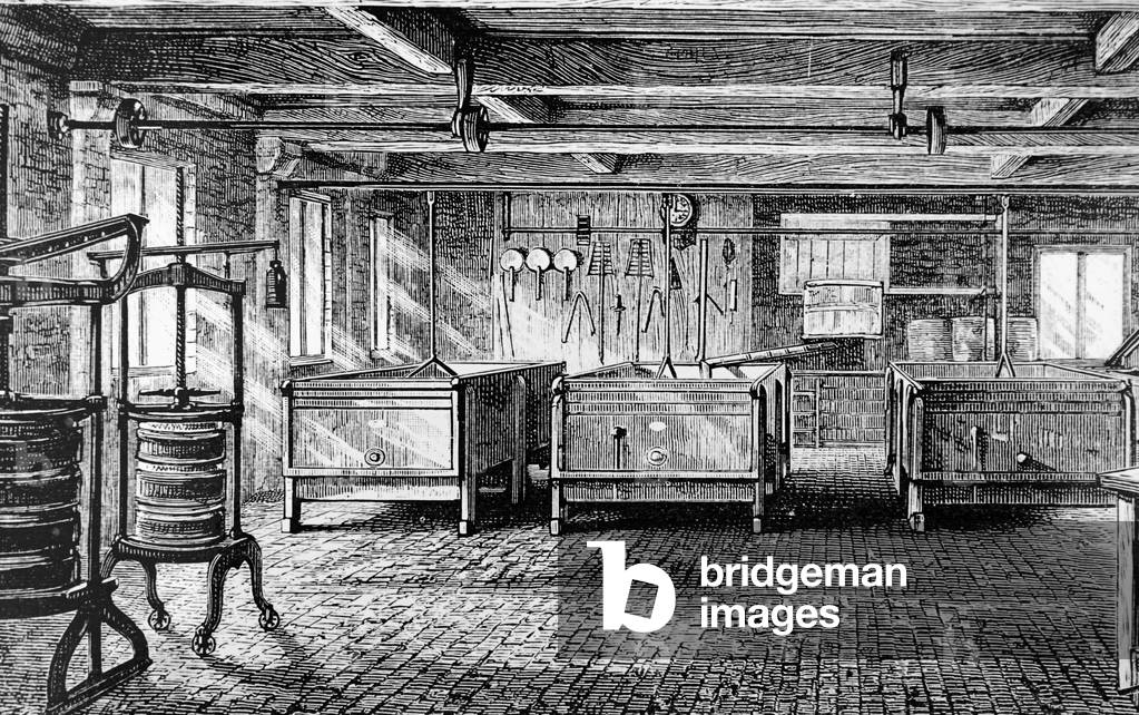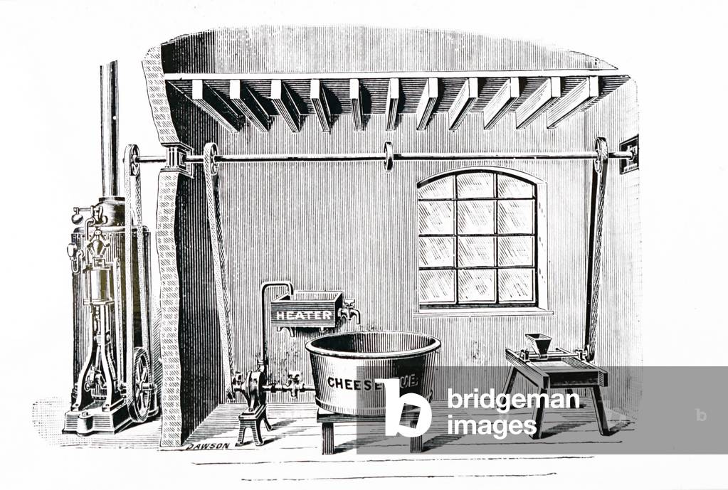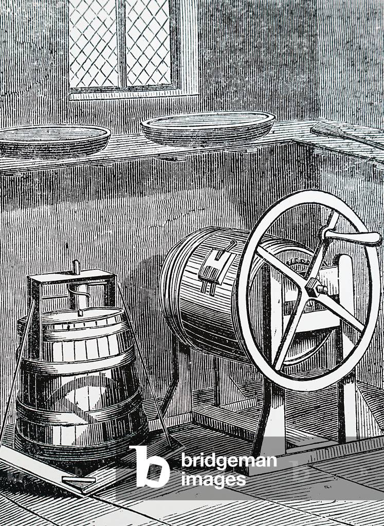 UIG3732549 Engraving depicting the interior of the Longford Cheese Factory, the first to be built in England. The making-room: when correct acidity reached, most of whey was drawn off by siphon. The remaining curd was allowed to run down the chute into a dry-vat, which contained cloth used to strain the curd from the whey. Salt was then added to the curd before it was put in presses. Dated 19th Century.