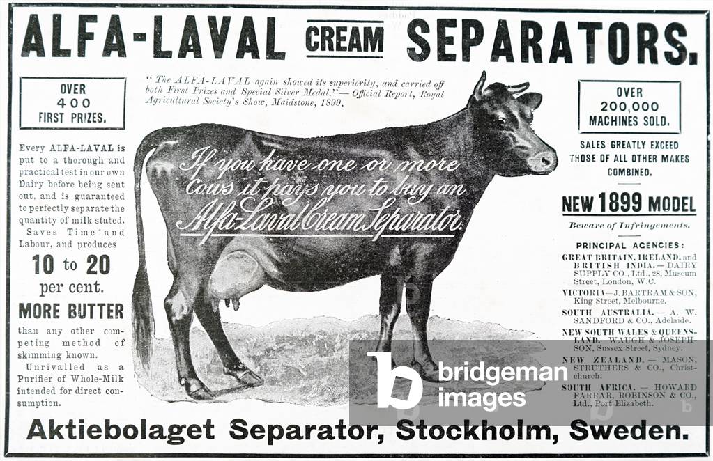 UIG3732506 Advert for 1899 model of the Alfa-Laval Cream Separators from Stockholm, Sweden. Dated 19th Century.
