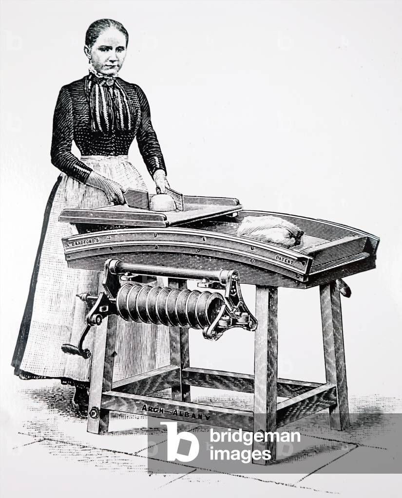 UIG3732527 Engraving depicting the Arch-Albany butter working machine, showing the helical roller put to one side, while the making-up board has been brought into position. Dated 19th Century.