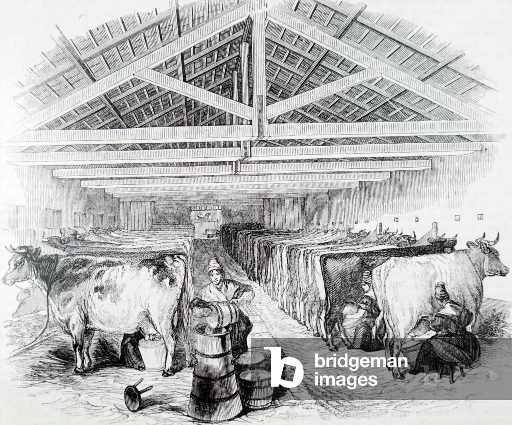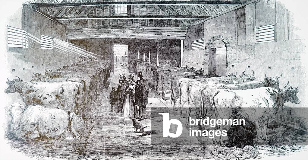 UIG3732497 Engraving depicting the milking shed of Friern Manor Dairy Farm in Peckham, London. Dated 19th Century.