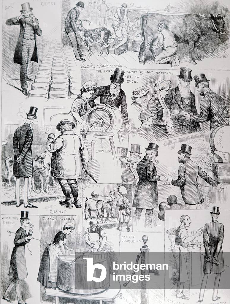 UIG3732507 Illustration depicting scenes from the dairy show at the Agricultural Hall in Islington, held by the British Dairy Farmer's Association. Dated 19th Century.