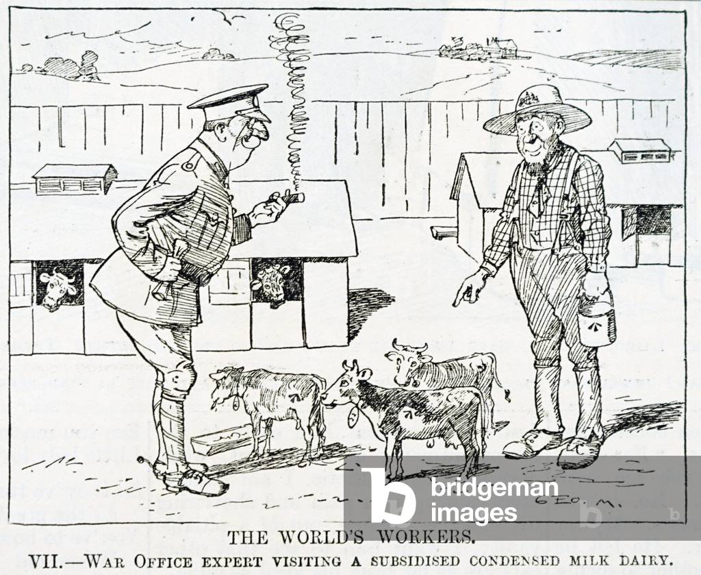 UIG3732517 Cartoon depicting a war office expert visiting a subsided condensed-milk. Dated 20th Century.