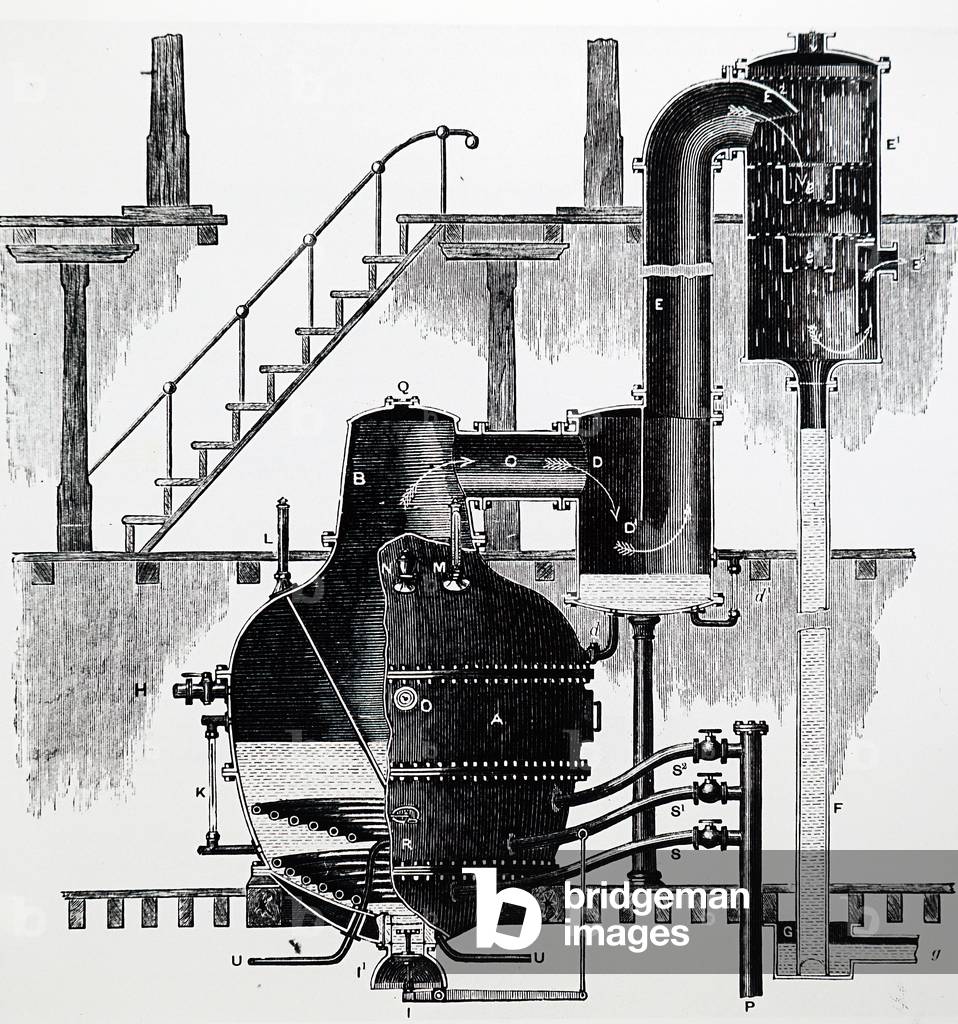 UIG3732817 Engraving depicting a milk condensing apparatus using a 10 ft 6in cast iron vacuum pan (B). The dome (B) is connected by vapour pipe (C ) to catcher (D) which is divided into two by an apron (D) to prevent boiling over. Vapour is led from catcher via a pipe to the condenser (E). Dated 19th Century.
