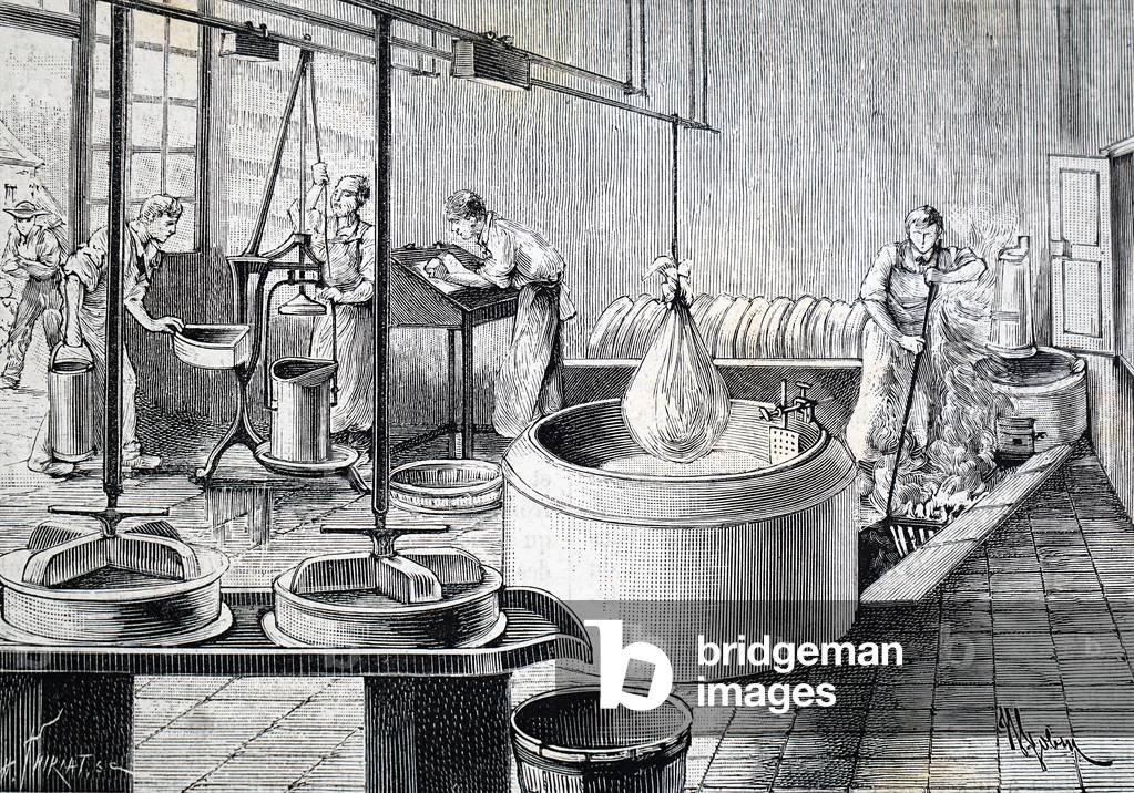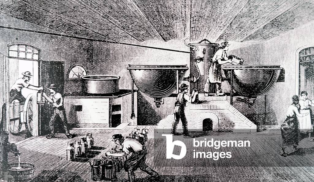 UIG3732550 Engraving depicting the making of Brie at the Maison-du-Val dairy in France. The process shown is the warming of the milk in a double-bottomed steam-heated pans before passing it to the cheese-making room where rennet was added. Dated 19th Century.