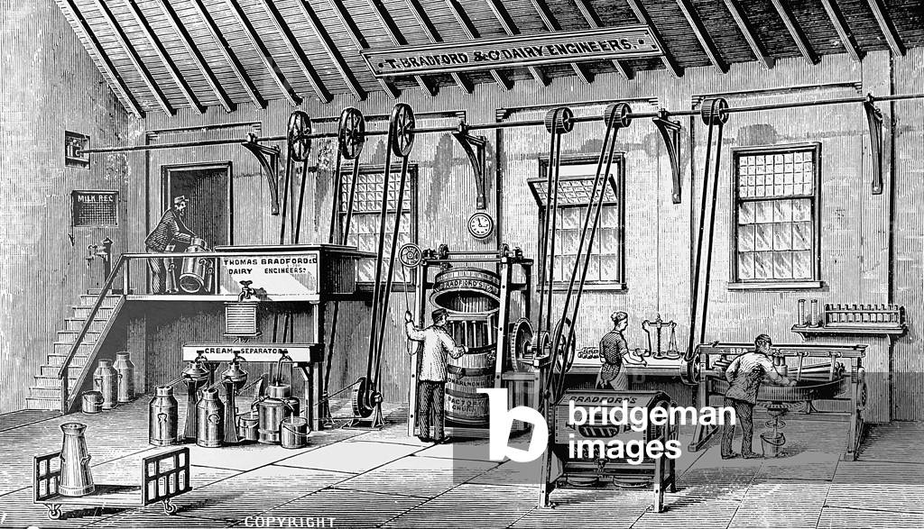UIG3732529 Engraving depicting a model butter factory, where the machinery was powered by a steam engine through belt and shaft drive. The milk was poured into the tank on the platform on the left, which was then allowed to run through a refrigerator into centrifugal cream separators below. The cream would then be put into churns, then passed to the working and blending machine on the right, and finally weighed and packed. Dated 19th Century.