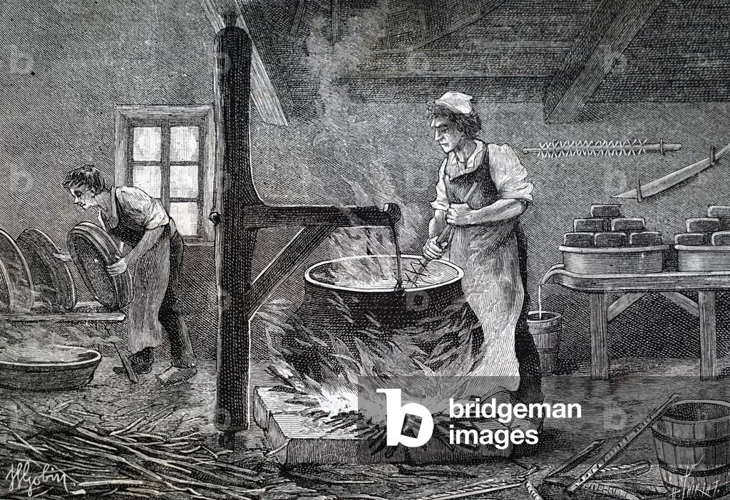 UIG3732849 Engraving depicting a French cheese workshop in Gruyere France. Dated 19th Century.