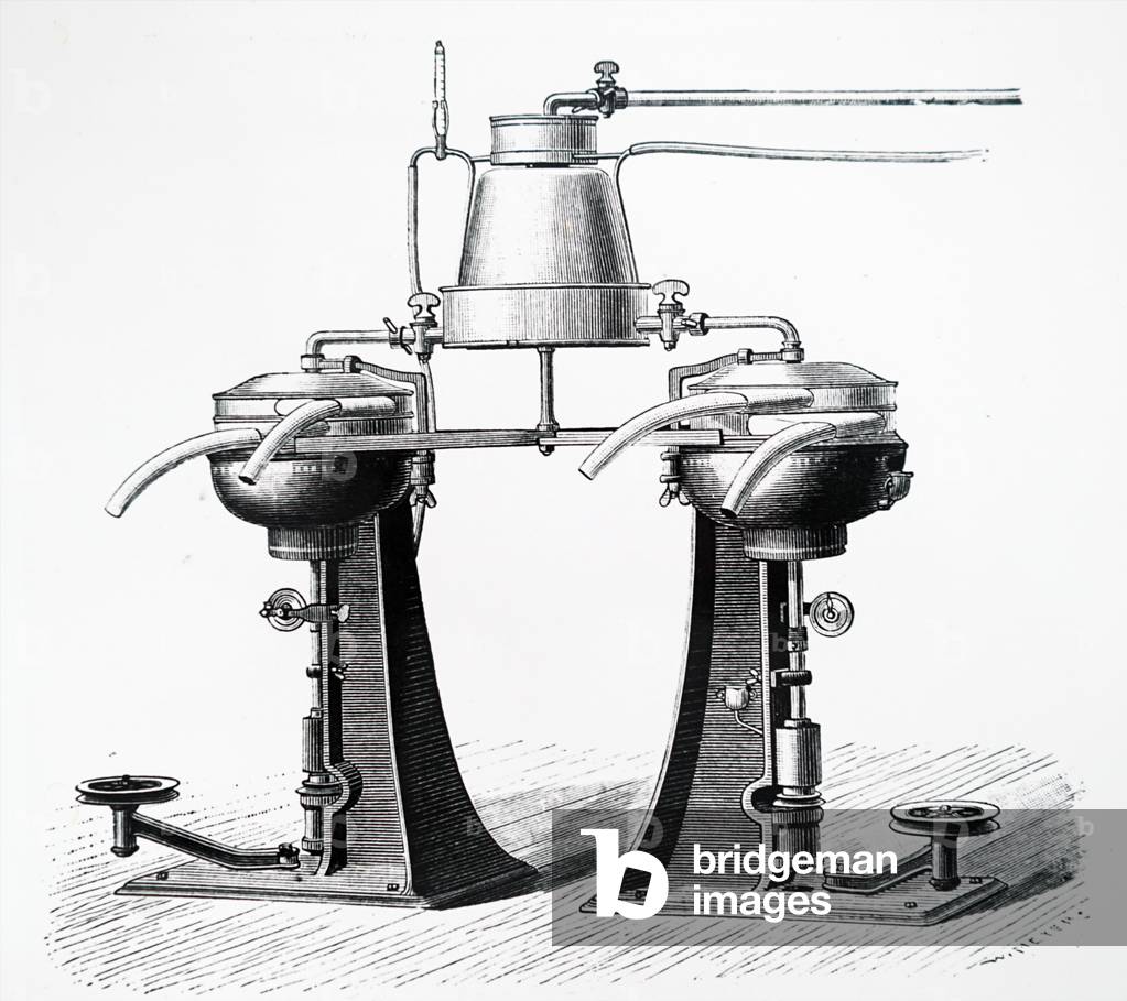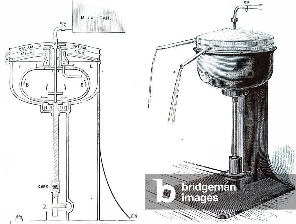UIG3732609 Engraving depicting a twin centrifugal cream separators with milk warmer mounted above them. These were belt-driven, either by steam or water power, and together could separate the cream from 150 gallons of milk each hour. Dated 19th Century.