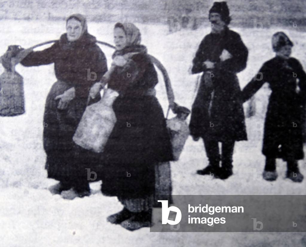 UIG3520809 Finnish milk-sellers pictured in a typical winter scene.