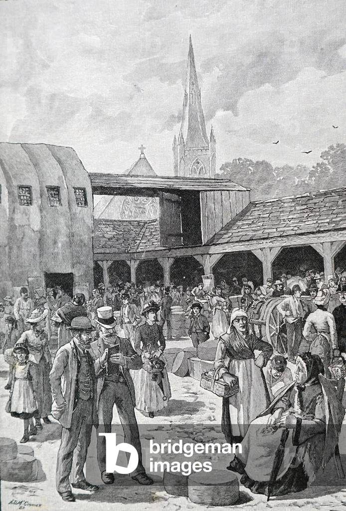 UIG3732840 Engraving depicting a cheese market in Chester, Britain. Dated 19th Century.