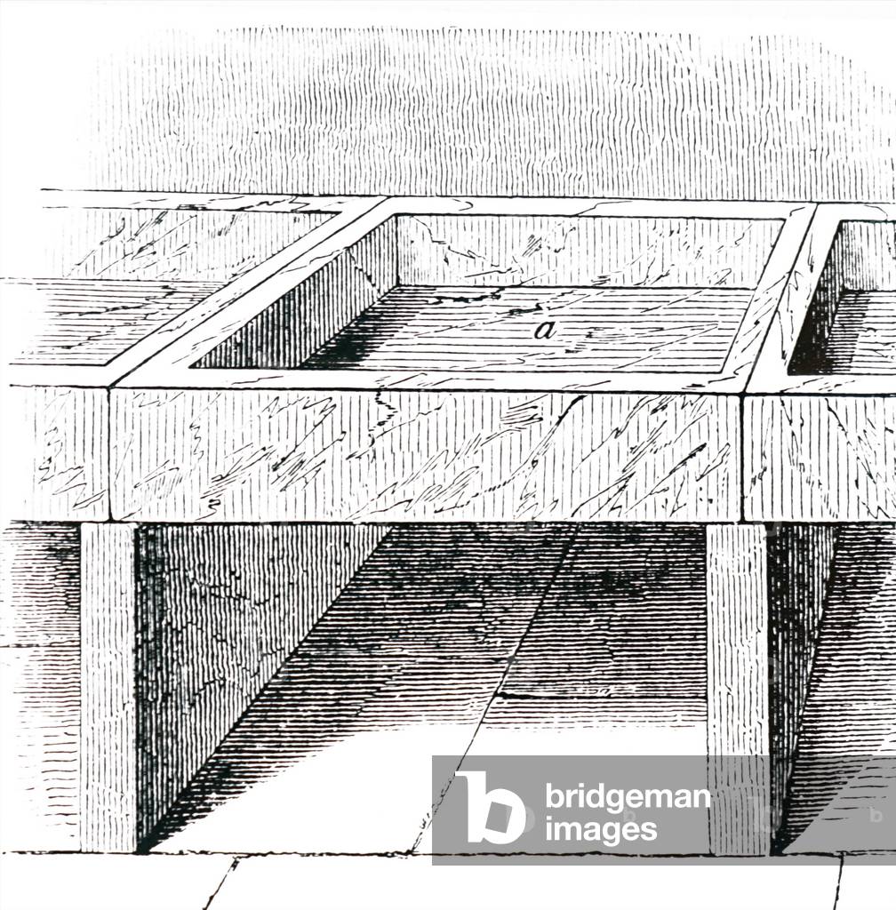 UIG3732520 Engraving depicting fixed milk dishes which could be marble, sandstone or wood lined with metal. Dated 19th Century.