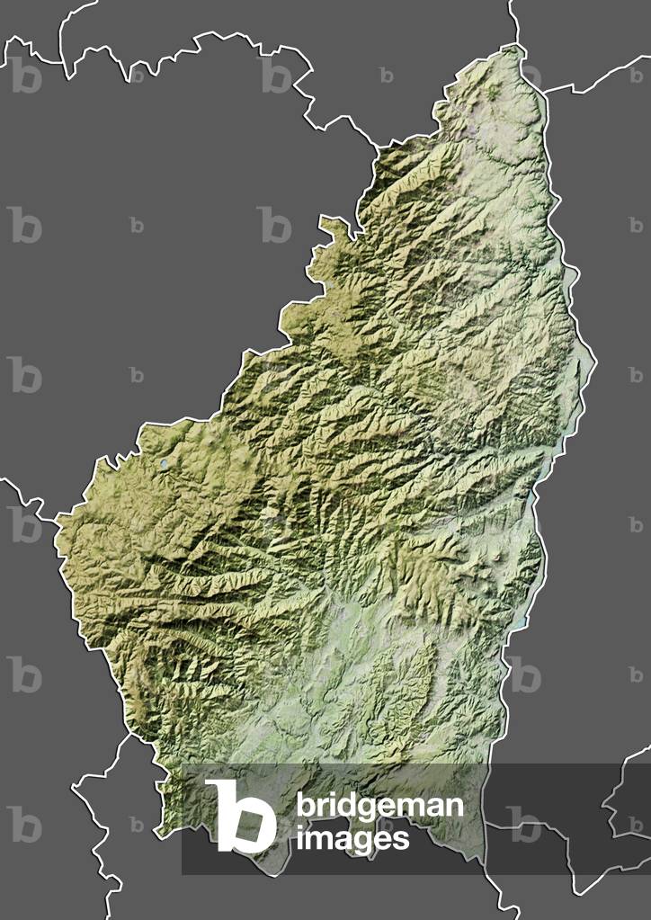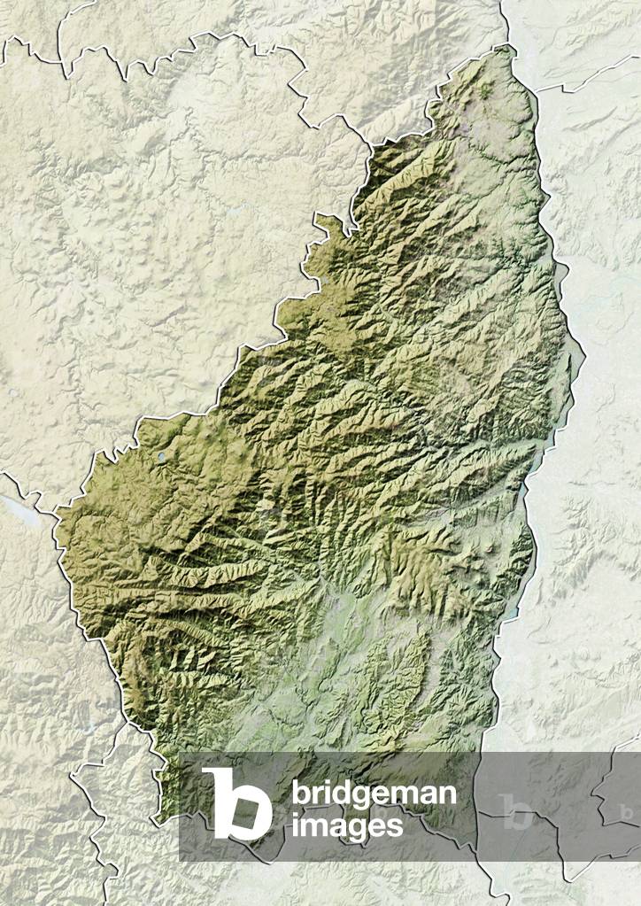 UIG673524 Relief map of the departement of Ardeche, France. It is bordered by the Rhone Valley to the east. This image was compiled from data acquired by LANDSAT 5 & 7 satellites combined with elevation data.