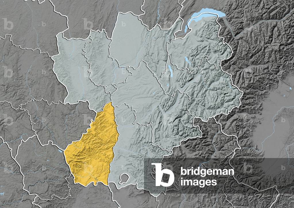 UIG674385 Relief map of the departement of Ardeche in Rhone-Alpes, France. It is bordered by the Rhone Valley to the east. This image was compiled from data acquired by LANDSAT 5 & 7 satellites combined with elevation data.