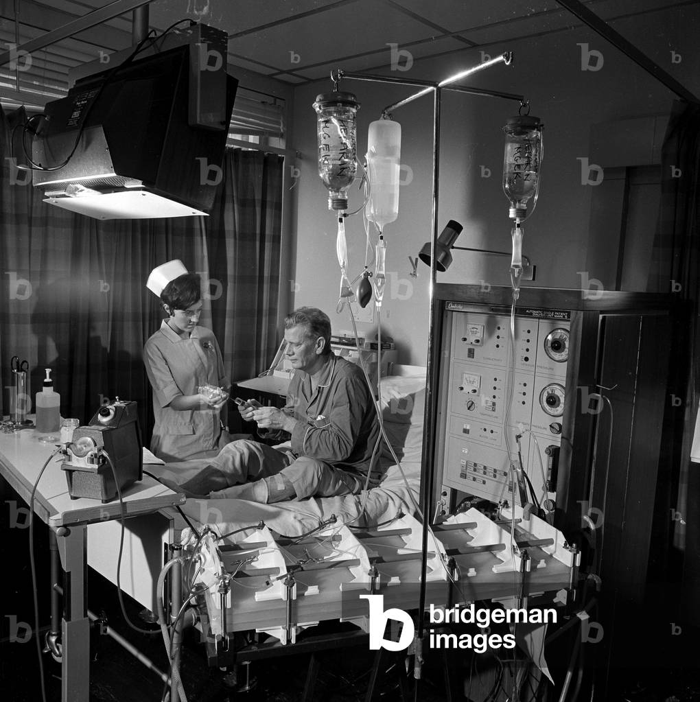 UIS5075582 Royal Free Hospital Renal Unit patient and nurse with dialysis machine, 1968. Photograph by Walter Nurnberg (1907-1991) who transformed industrial photography after WWII using film studio lighting techniques. Photographie ©SSPL/NMeM/Walter Nurnberg