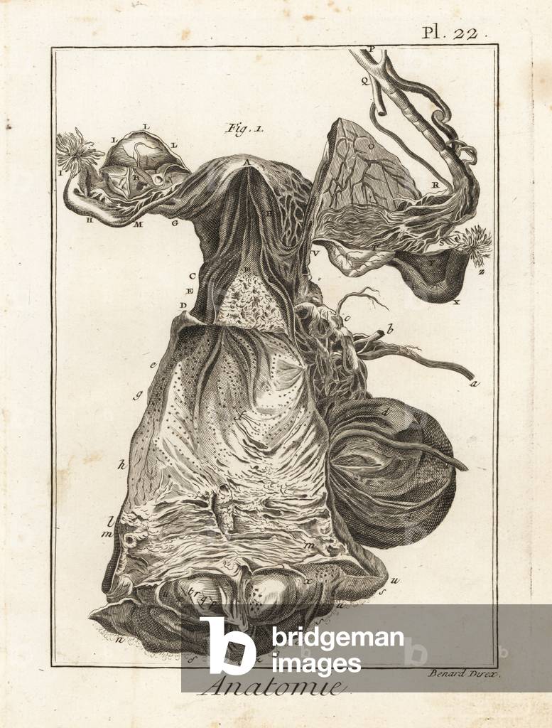 FLO4611684 Details of the uterus and female reproductive system including hymen, ovaries, Fallopian tubes, cervix, blood vessels, etc. Copperplate engraving by Robert Benard after an illustration by Albrecht von Haller from Denis Diderot's Encyclopedia, Pellet, Geneva, 1779.