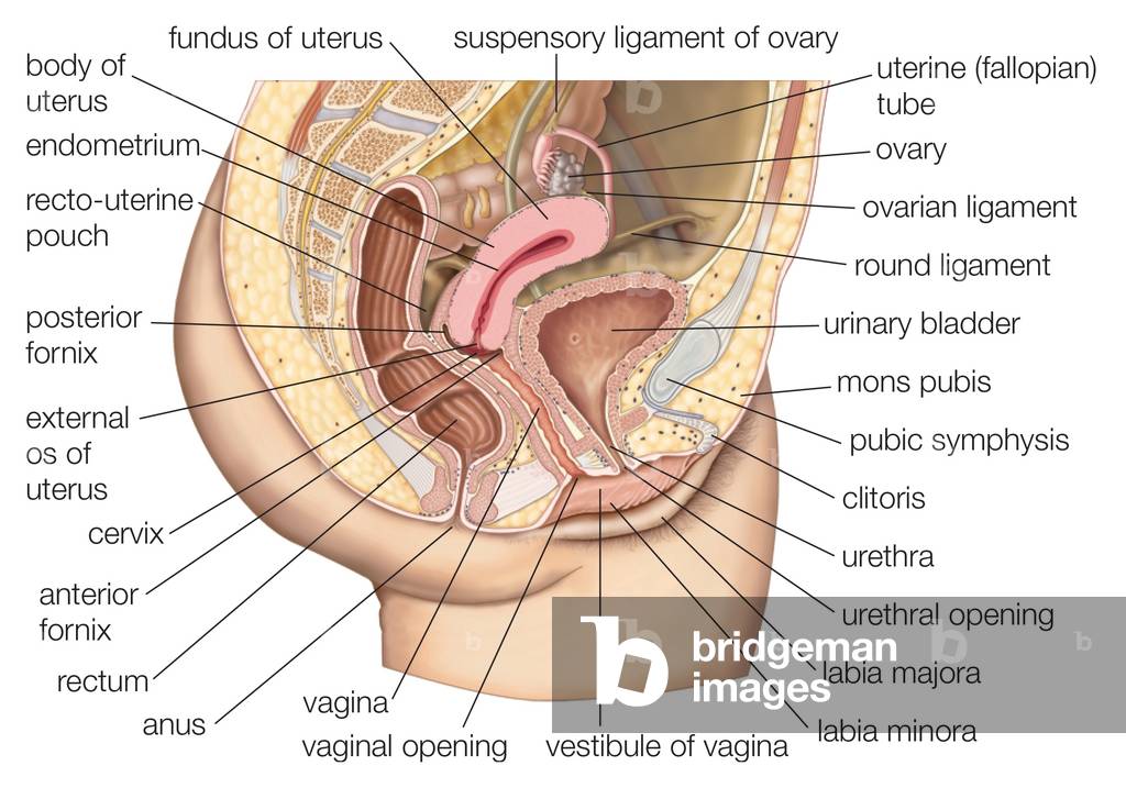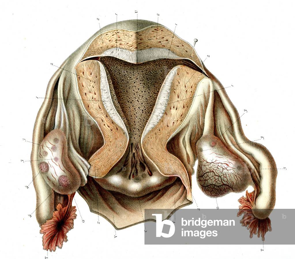 JAB4119175 Female reproductive system 1866 illustration showing the female internal reproductive organs Fig 1: vagina (bottom centre), cervix (opening of the uterus, lower centre), uterus (womb, upper centre), ovaries (beige, oval left and right), fallopian tubes (horizontal, left and right), fimbriae (feathery) of the infundibulum (far left and right) Fig 2: vagina (vagina ( Bottom half), cervix (center), uterus (top centre) Internal genitals of women - Fig 1: vagina open forward and ovaries, Fig 2: vagina and uterus open (posterieure part), 1866
