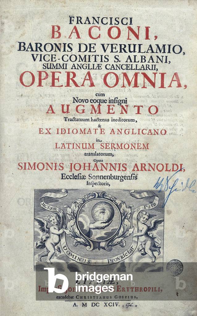 IBE5352675 Frontispiece of “Complete Works” (Opera omnia) by Francis Bacon (1561-1626), English Chancellor and Philosopher, 1694 Barcelona.