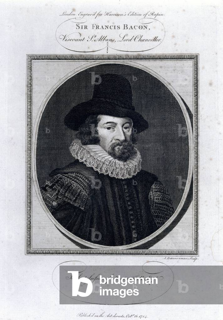 UIS5092135 Francis Bacon, English philosopher, c 1600s. Engraving made in the mid to late 18th century by A Bannerman, showing the English statesman, essayist and philosopher Sir Francis Bacon (1561-1626). Bacon is perhaps best known for stressing the importance of scientific experiment in interpreting nature, and for demanding factual evidence rather than rely on deductive logic. His writings had a profound influence on later scientific thought. Published 16 October 1784. Dimensions: 310mm x 200mm. ©SSPL/Science Museum