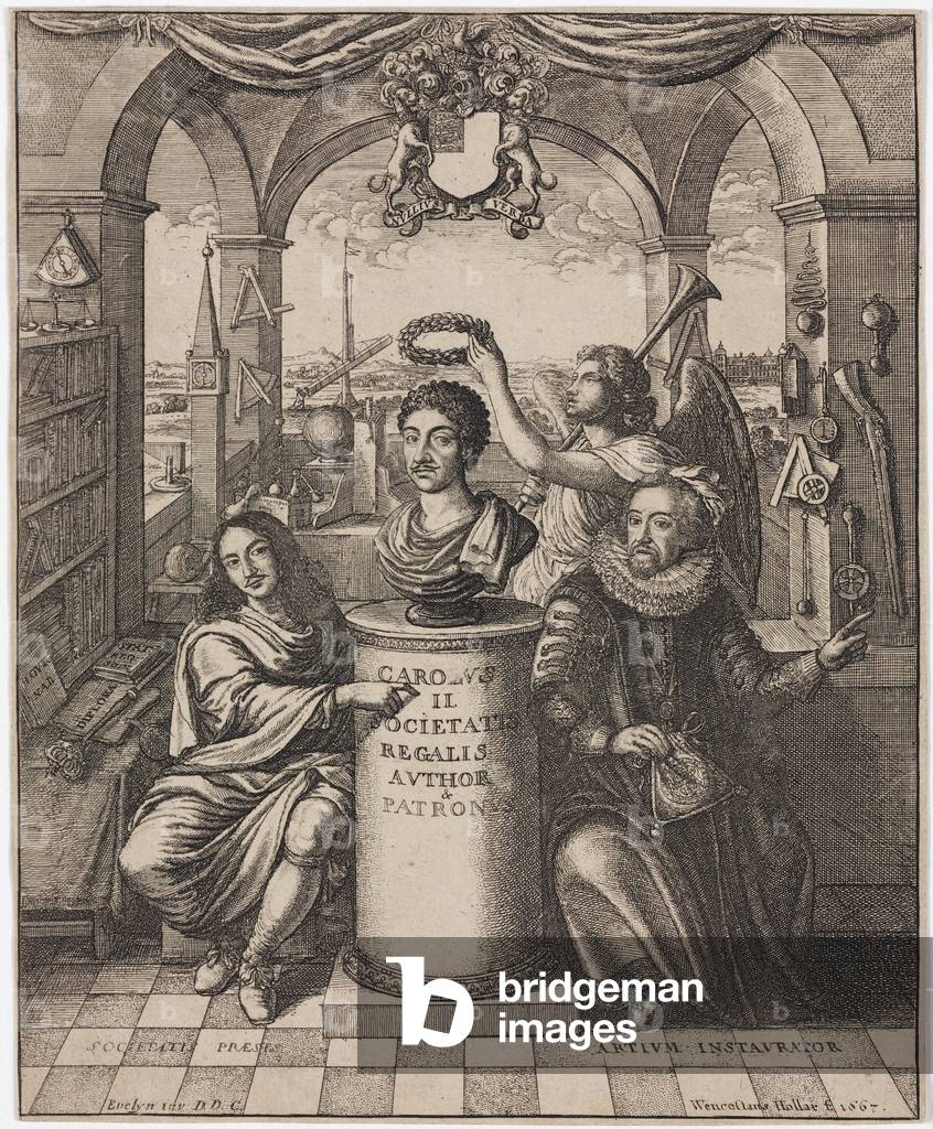 UIS5070867 King Charles II, Viscount Brouncker and Francis Bacon, 16th-17th century. Engraving by Wenceslaus Hollar of 1667, after Evelyn. Frontispiece (in the larger impressions) to the first edition of Sprat's 'History of the Royal Society of London' (1667). In the centre is a bust of King Charles II (1630-1685), patron of the Society, flanked (left) by Viscount Brouncker (c 1620-1684), mathematician and first president of the Society, and (right) Sir Francis Bacon (1561-1626) statesman and essayist. Bacon, who lived much earlier, was revered by scientists for the so-called Baconian method. This argued that the great scientific problem is to analyse the experience by mechanical means so as to arrive at true conclusions. Bacon was the instigator of the concept of a society of scientists and philosophers. Dimensions: 200mm x 165mm. ©SSPL/Science Museum