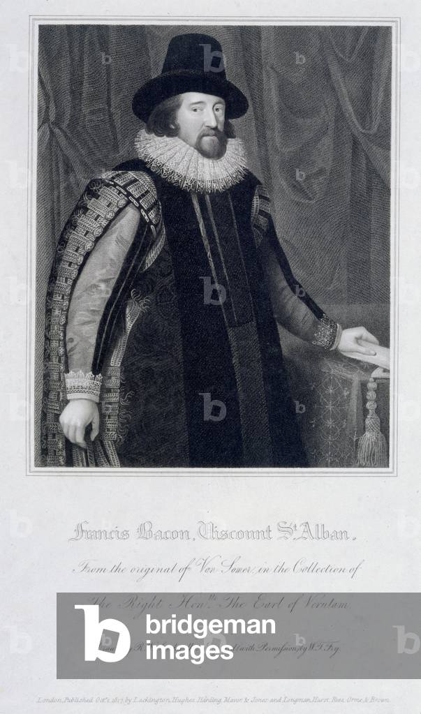 UIS5092130 Francis Bacon, English philosopher, c 1600s. Engraved by R W Fry of 1817, after a drawing by R W Satchwell, of the English statesman, essayist and philosopher Sir Francis Bacon (1561-1626). Bacon is perhaps best known for stressing the importance of scientific experiment in interpreting nature, and for demanding factual evidence rather than rely on deductive logic. His writings had a profound influence on later scientific thought. ©SSPL/Science Museum