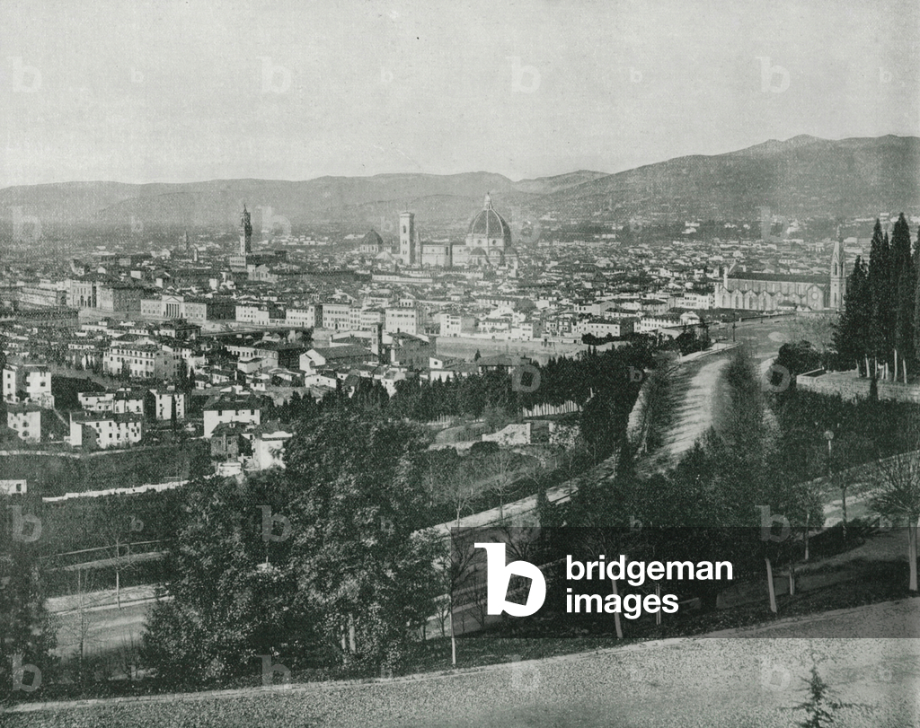 Panorama of Florence, Italy. To one who visits the Old World with a keen appreciation of its History, Biography and Art, perhaps no European city proves more attractive than that which greets as here, in beauty, where-"On the bright enchanting plain, Fair Florence 'neath the sunshine lies, And towering high o'er roof and fane, Her Duomo soars into the skies!" What a priceless debt of gratitude we owe to this fair Tuscan Athens! A debt so vast that we are quite unable to express its magnitude. After the appalling gloom of the Dark Ages, which, on the downfall of Imperial Rome, folded entire Europe in its shroud, the first pale streaks of light, announcing the approaching dawn of a new age, appeared above these walls of Florence! 'Tis true, the glory which succeeded that bright dawn did not last long. Its splendour searce outlived two centuries. But in that time Italian art and literature reached their zenith, and Florence ever since has been a treasure-house for those who prize inspiring memories and forms which live again on canvas or in marble. What wonder, then, that this fair eity of the Renaissance, girt by its amphitheatre of vine-clad hills, cleft by the current of the smiling Arno, and guarded by the Tuscan Apennines, is not alone a beacon-light in the world's history, but one of the most enchanting spots upon the surface of our globe! From a Portfolio of Photographs (Werner, c 1890).By American Photographer (19th Century)