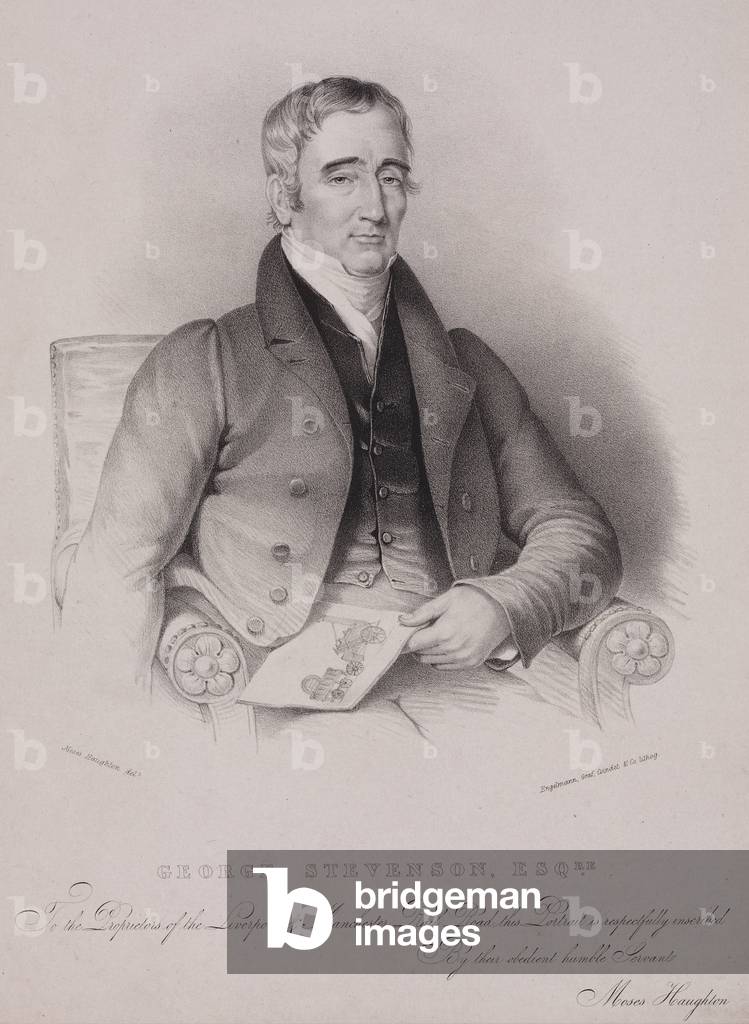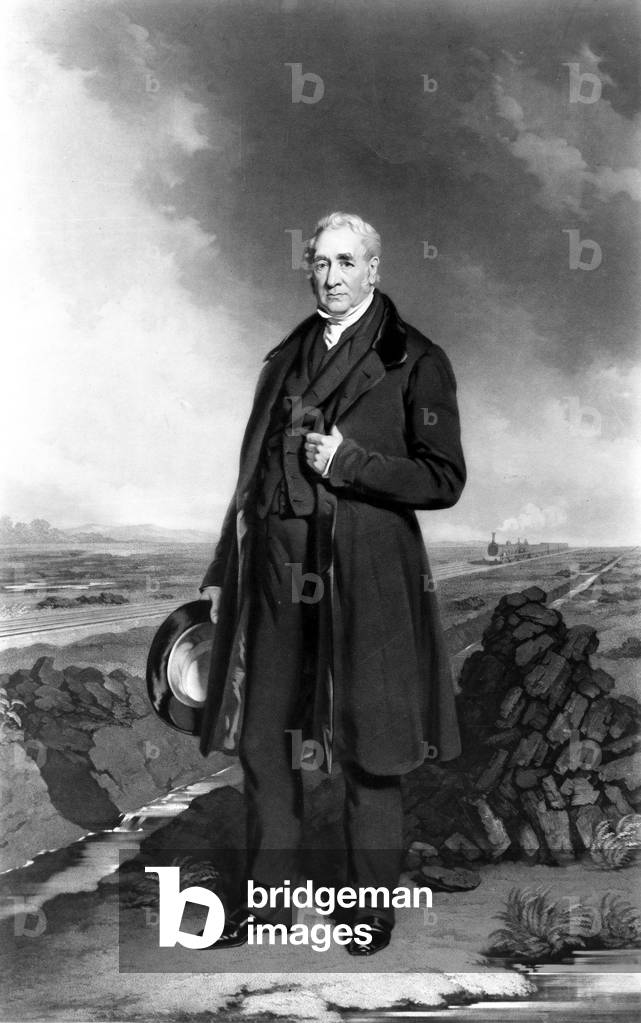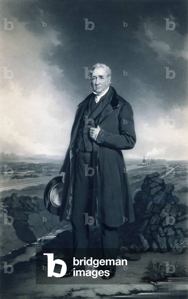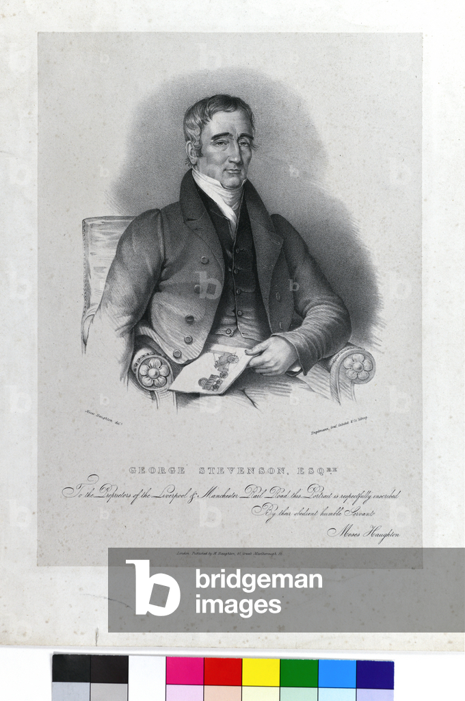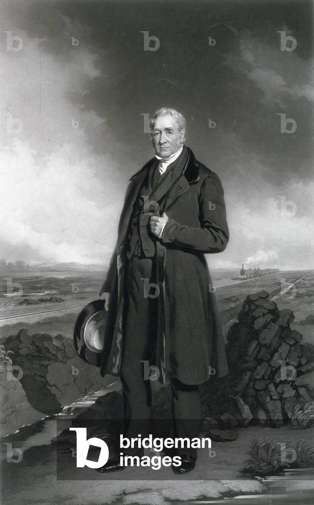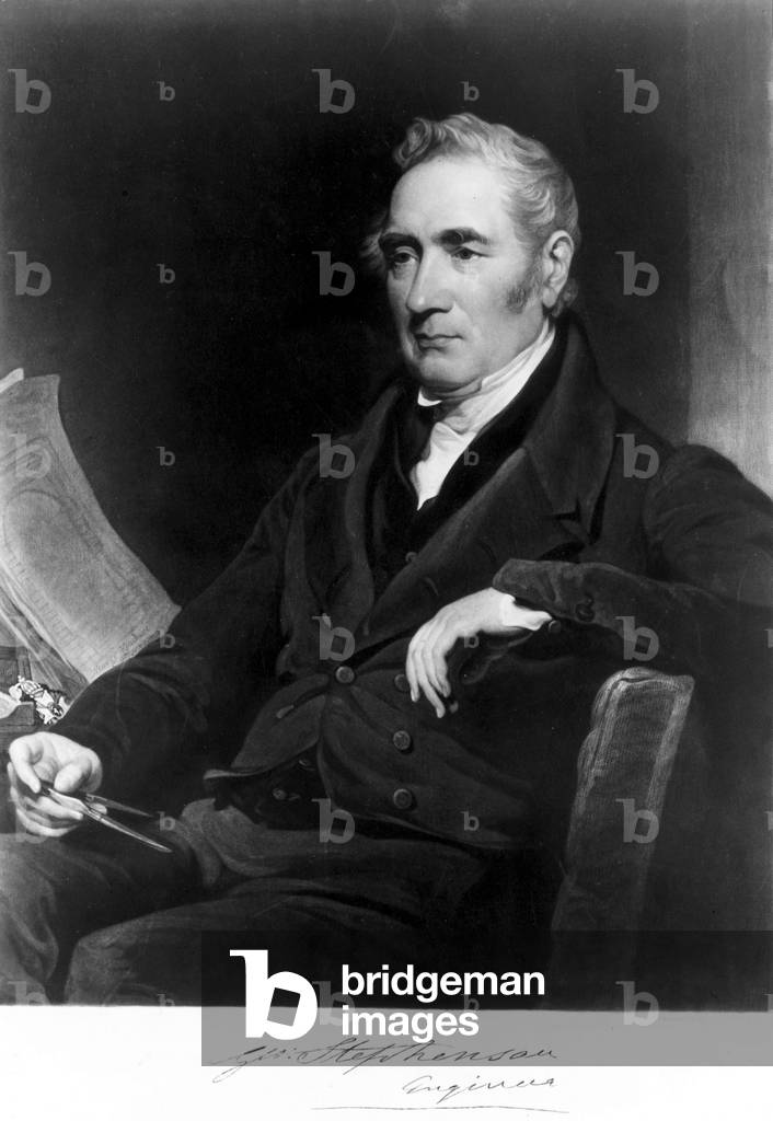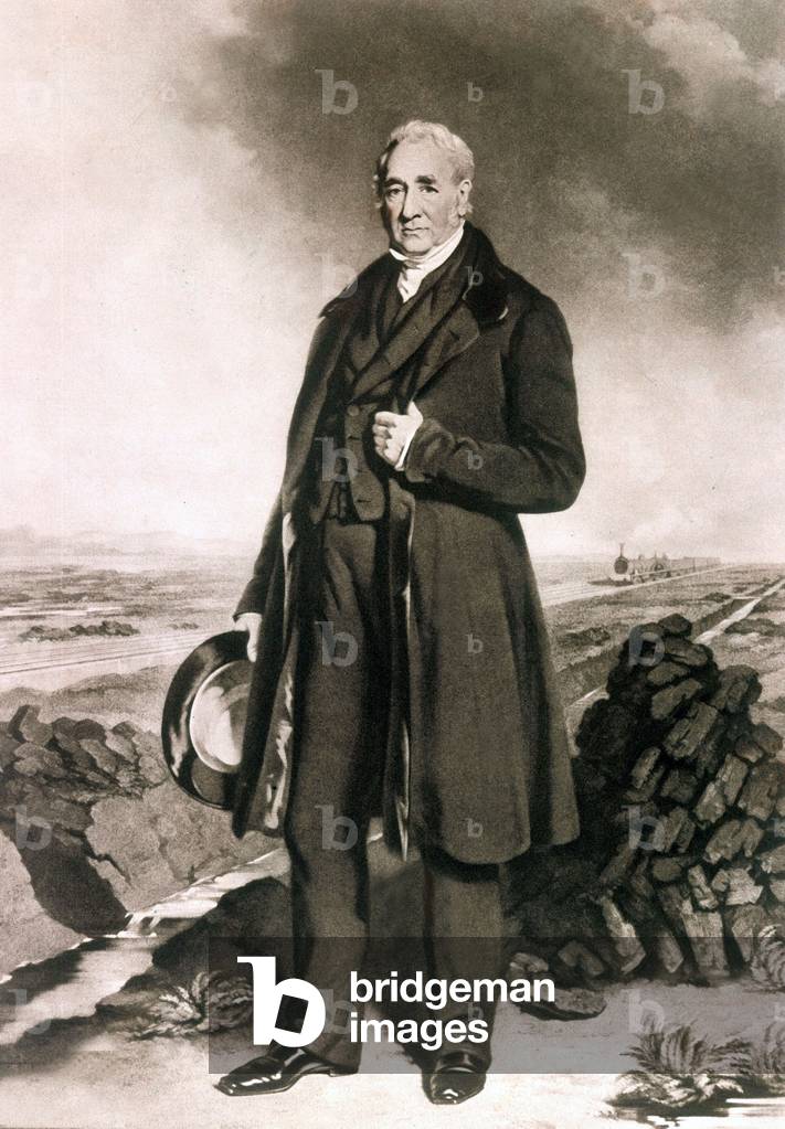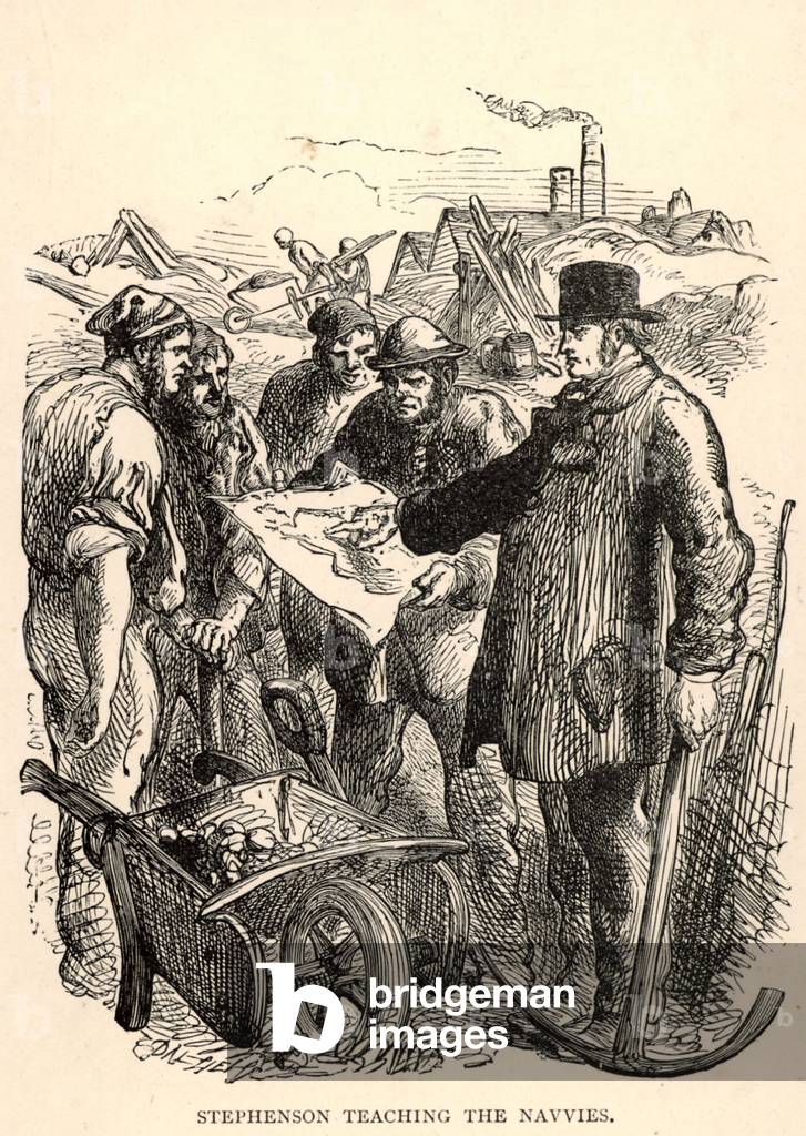 George Stephenson (1781-1848) English mechanical engineer and railway pioneer, born at Wylam, near Newcastle upon Tyne, Northumberland. Stephenson instructing the navvies constructing the Liverpool and Manchester Railway, England, which was opened in September 1830. From "The Triumphs of Steam" by Henry Frith (London, c1898). Engraving.