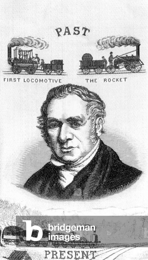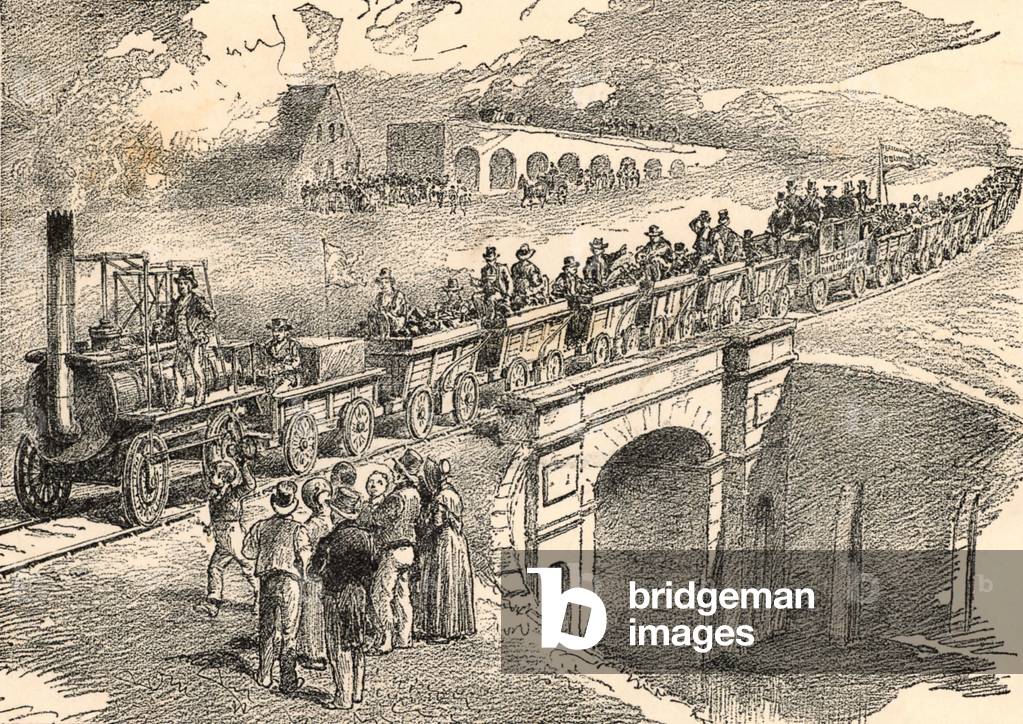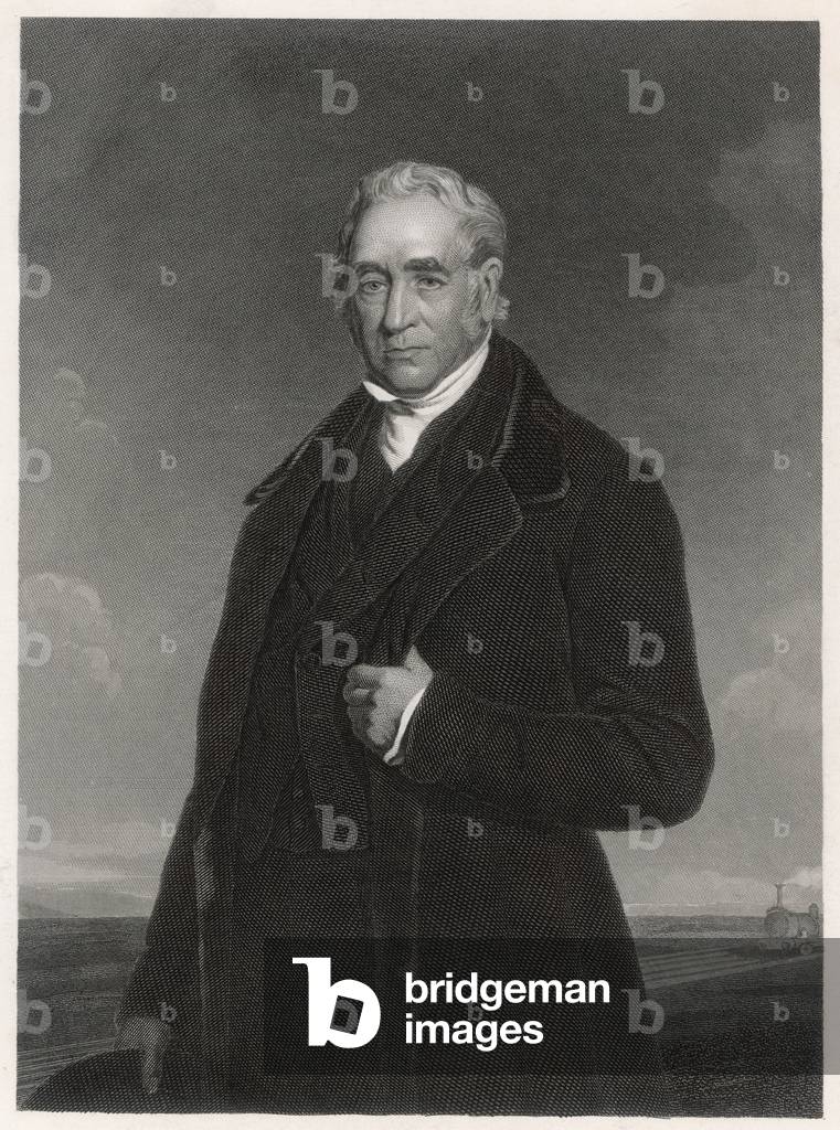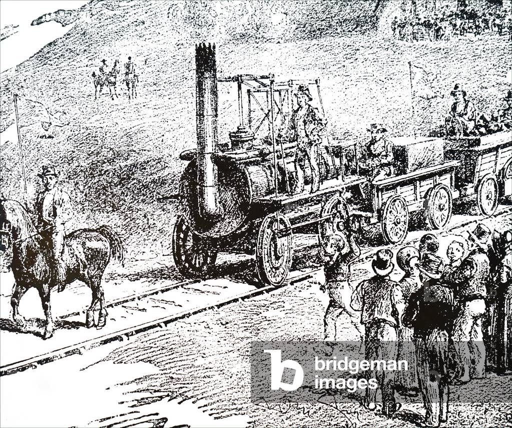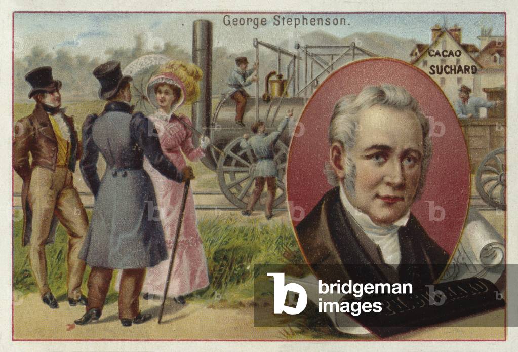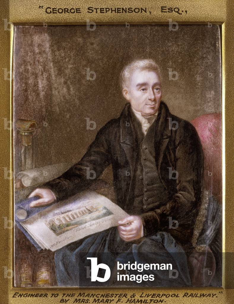 George Stephenson (1781-1848) English mechanical engineer and railway pioneer, born at Wylam, near Newcastle upon Tyne, Northumberland. Stephenson instructing the navvies constructing the Liverpool and Manchester Railway, England, which was opened in September 1830. From "The Triumphs of Steam" by Henry Frith (London, c1898). Engraving.