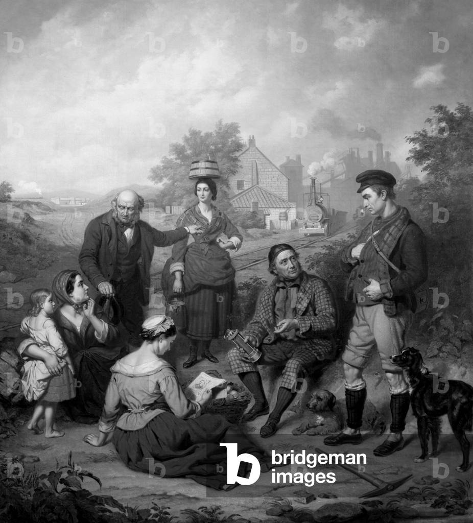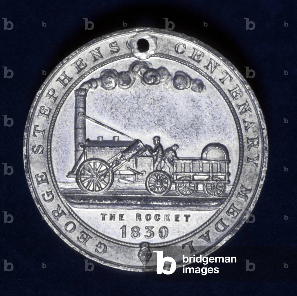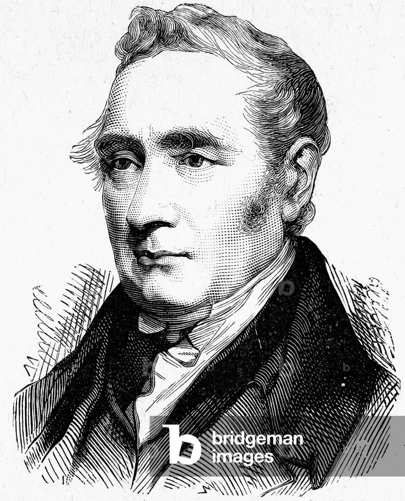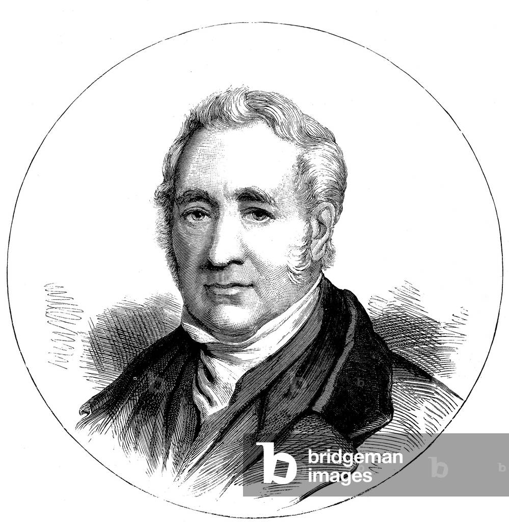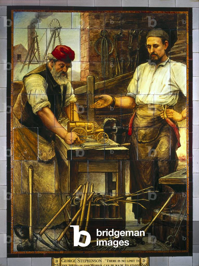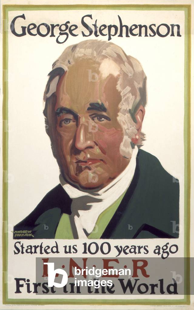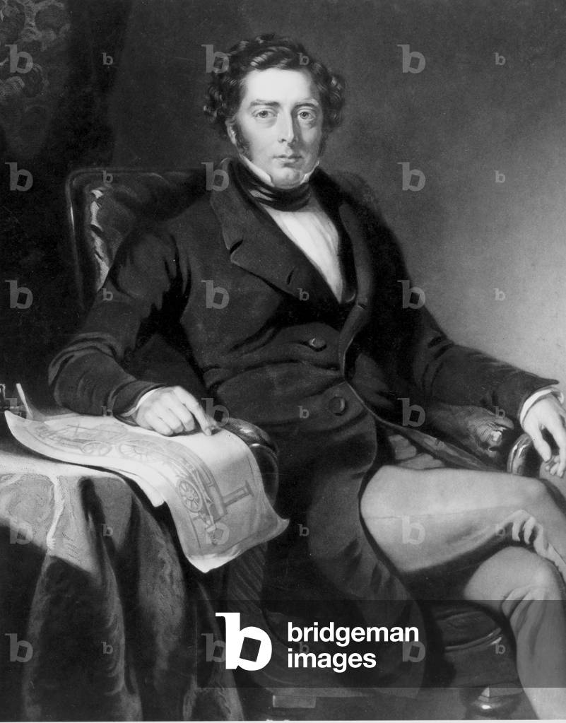 George Stephenson (1781-1848) English mechanical engineer and railway pioneer, born at Wylam, near Newcastle upon Tyne, Northumberland. Stephenson instructing the navvies constructing the Liverpool and Manchester Railway, England, which was opened in September 1830. From "The Triumphs of Steam" by Henry Frith (London, c1898). Engraving.