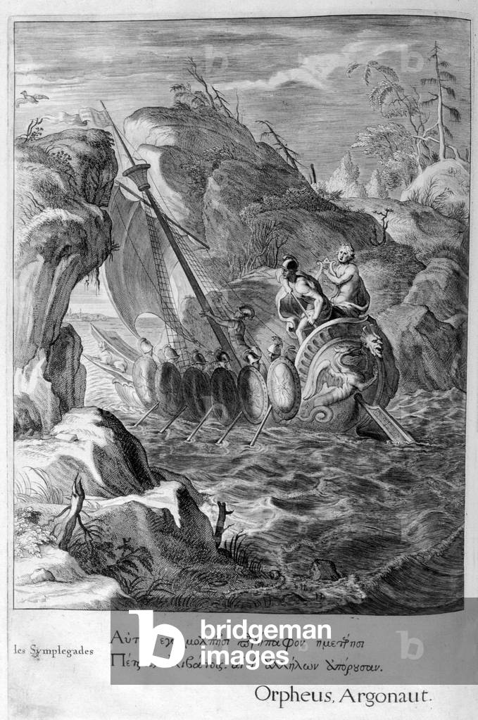 UIG3480509 Jason and the Argonauts sail through the Symplegades (Clashing Rocks). Engraving depicting Jason and the Argonuats from 'Tableaux du temple des muses' (1655) by Michel de Marolles (1600 - 1681), known as the abbe de Marolles; a French churchman and translator. The Argonauts were a band of heroes in Greek mythology, who in the years before the Trojan War, around 1300 BC, accompanied Jason to Colchis in his quest to find the Golden Fleece.