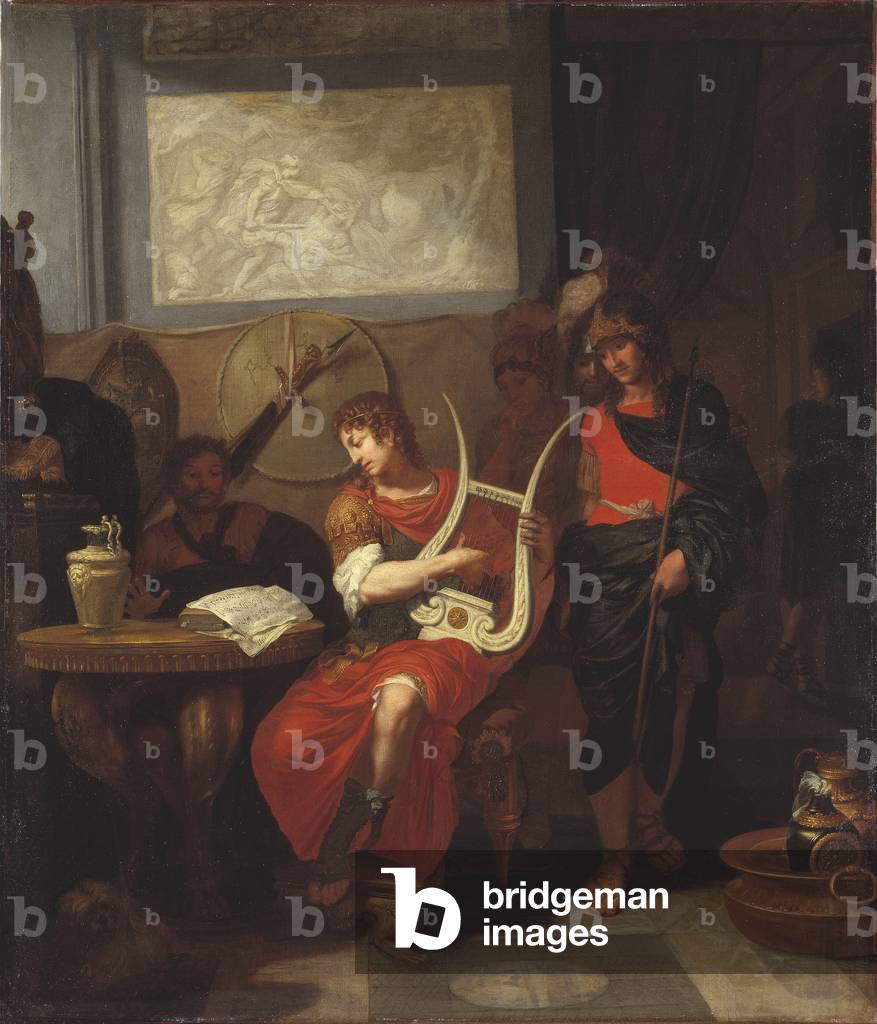 XOS3930851 Achilles has withdrawn from fighting, angry with Agamemnon for stealing his slave girl. In his tent he sings of fighting heroes to his friend Patrocles, when Odysseus arrives from the Greek commander Agamemnon urging him to return to the battle.