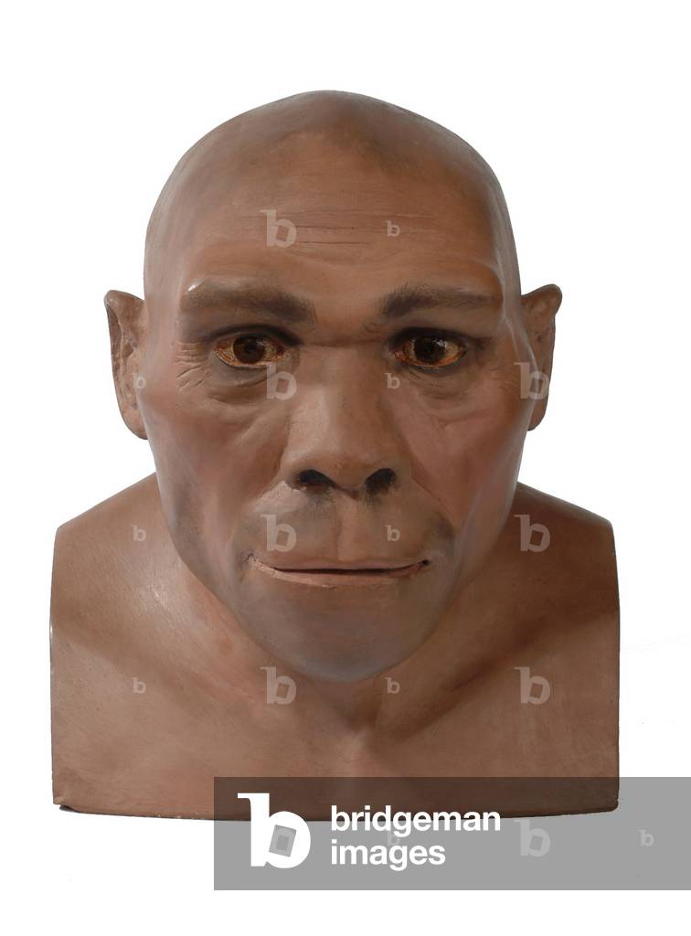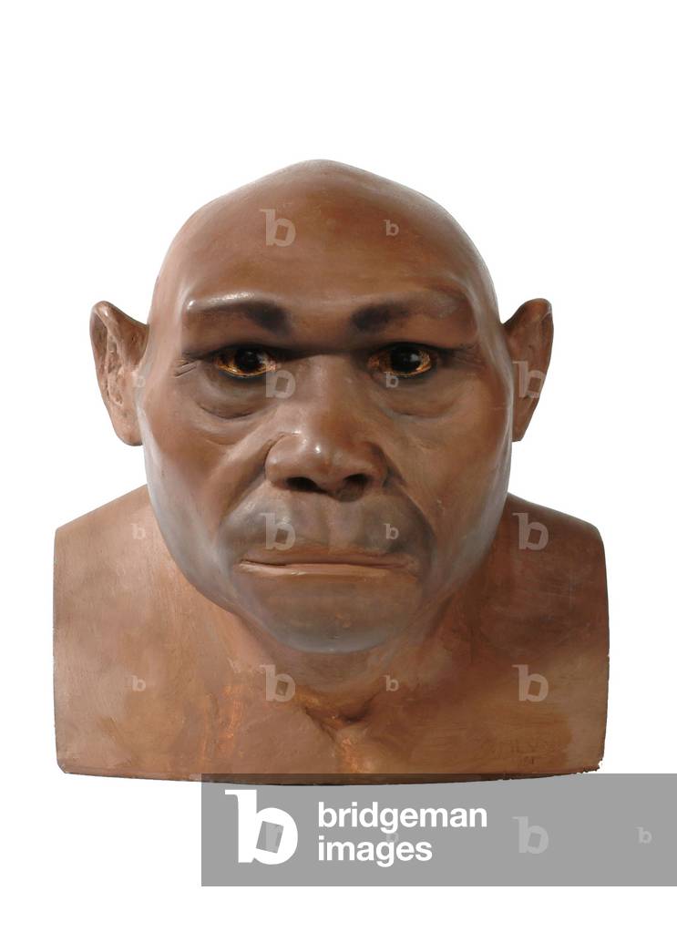 NHM1456352 Homo erectus, Java man, A model of Homo erectus, known as Java man, based on fossil evidence found in archaeological sites along the Solo River, Indonesia. The fossils date back to around 500,000 to 800,000 years ago. By Maurice Wilson. - AncestorLondon UK
