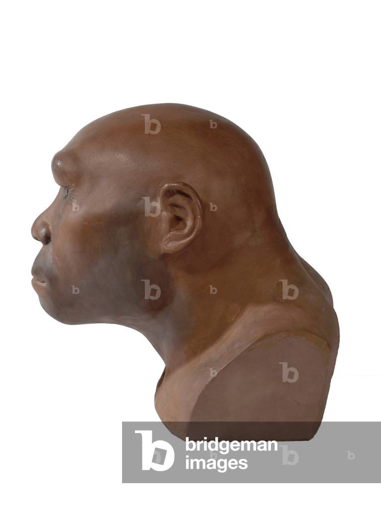 NHM1456351 Homo erectus, Peking man, A model head of Homo erectus known as Peking man, based upon evidence discovered at Zhoukoudian Cave (Locality 1), China dating back 500,000 years. This model was created by Maurice Wilson. - AncestorLondon UK