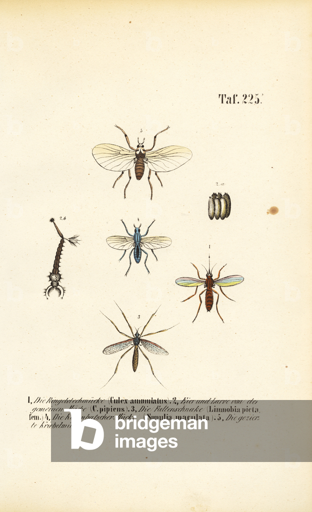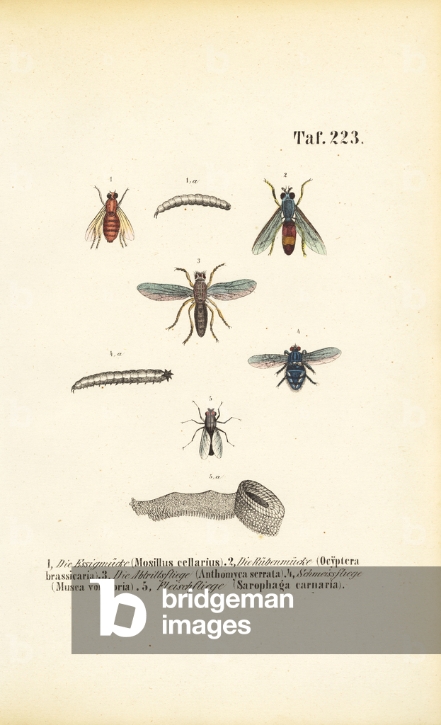 From Naturgeschichte des Tierreichs (Natural History of the Animal Kingdom), published by Emil Hänselmann, c.1921Gemeine Stechmücke, Gallmücke, Kohlschnake, Hornissenähnliche Raubfliege, Rinderbremse, Großer Wollschweber, Chamäleonsfliege, Midas, Goldfliege, Blaue Schmeißfliege, Schwammfliege oder Mistbiene, Schwebfliege, Gebänderte Federfliege oder Hornissenschwebfliege, Rinderbiesfliege, Pferdebiesfliege, Marokkanische Mordfliege, Insekten, Illustration, Naturgeschichte, Tiere, InsektenCulex pipiens, Cecidomyia leucopeza, Tibula oleracea, Tipula oleracea, Asilus crabroniformis, Tabanus bovinus, Bombylius major, Stratiomys chamaeleon, Midas giganteus, Musca caesar, Lucilia caesar, Musca vomitoria, Calliphora vomitoria, Eristalis tenax, Syrphus pirastri, Volucella zonaria, Oestrus bovis, Oestrus equi, Laphria maroccana