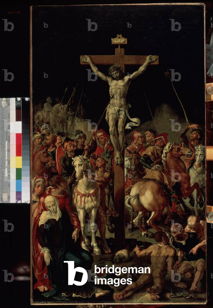 FIA5331887 ""Le calvaire"" (Calvary) La crucifixion. Inscription ""INRI"" sur la croix. Panneau central d'un triptyque. Peinture de Maarten van Heemskerck (Maerten Heemskerk van Veen) (Marten, Martin) (1498-1574) 1545-1550 Dim. 100.7x58.3 cm Musee de l'ermitage, Saint Petersbourg
