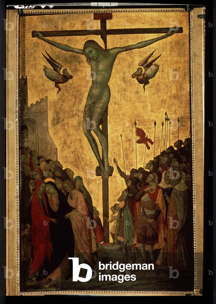 FIA5331858 Calvaire (Calvary). inscription ""INRI"" sur la crox. Peinture de Ugolino Lorenzetti (precedemment nomme aussi Maestro d'Ovile, 1300/10-1378), 14eme siecle. Tempera sur bois. Art italien de Sienne, style gothique. Musee de l'Ermitage, Saint Petersbourg.