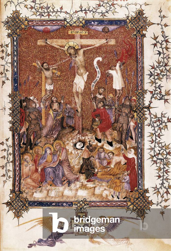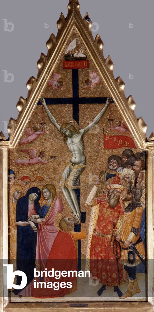JEB4897806 Virgin and Child, detail: the Crucifixion (top panel). At the top of the cross a nest with storks and the inscription INRI (I.N.R.I.). Roman soldiers carry the banner S.P.Q.R (SPQR) (Senatus Populusque Romanus) emblem of Rome. Saint Mary Magdalene wears at the feet of Christ while Saint John holds the Virgin Mary who fainted. Angels collect blood from Christ's veins while others hide their faces in their hands to cry. Painting by Giovanni Del Biondo (ca. 1356-1398), 1345. Polyptych. Italian altarpiece. Dim: 99x53cm. Oil on wood. Cathedrale Sainte Cecile, Albi.