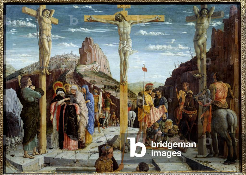 LRI4579331 By Andrea MantegnaThe Crucifixion, called The Calvary Inri (I N R I) inscription on the cross - On the sides, representation of the good thief (also called Saint Dismas (or Dysmas, Dimas, Dumas) and the evil thief (Gesmas or Gestas), two thieves crucified with Jesus Christ - Central panel of the predelle of the Altarpiece of San Zeno