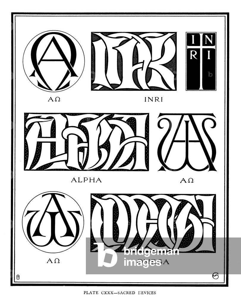 LLM11713052 Sacred Devices, alpha, omega, INRI. Illustration for Monograms and Ciphers designed and drawn by A A Turbayne and other members of the Carlton Studio (Caxton, 1905).By English School (20th century)