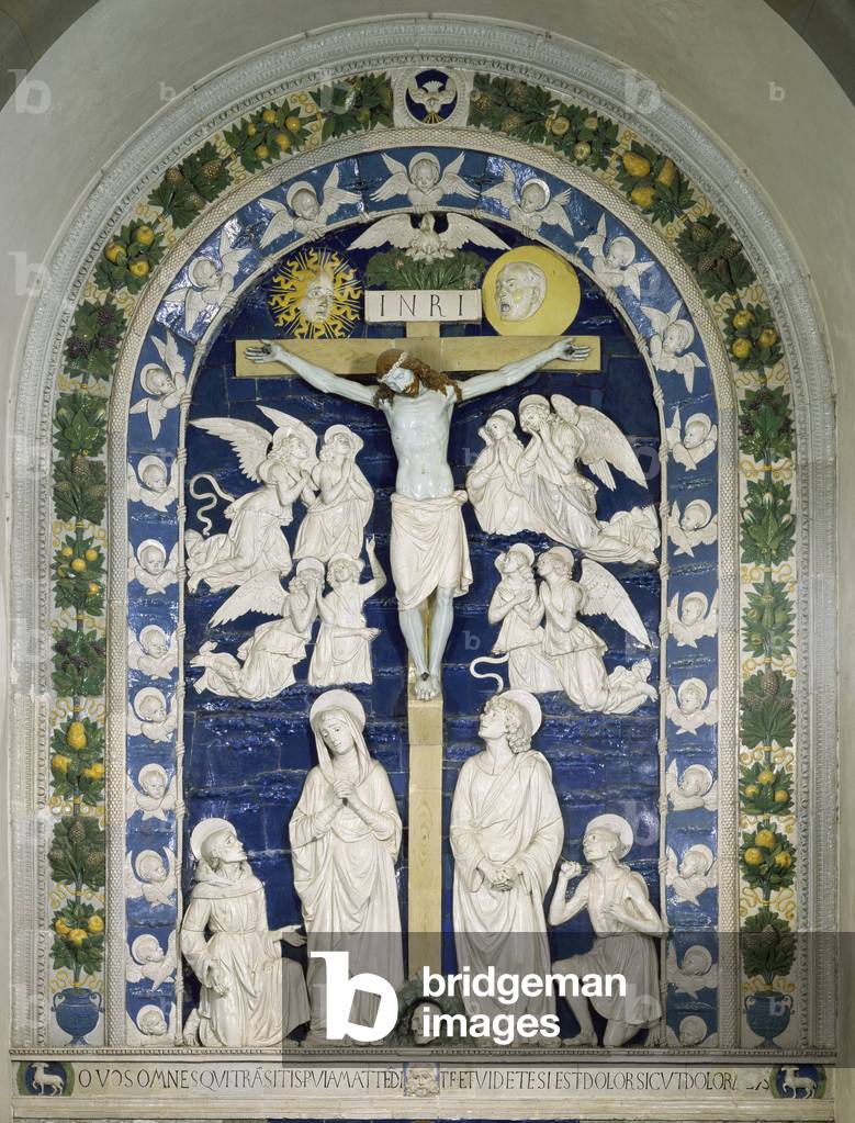 LRI4691081 The crucifixion with Saint Francois of Assisi, Saint John Evangelist and Saint Jerome Inscribed INRI (I.N.R.I.) on the cross. High relief ceramic by Andrea della Robbia (1435-1525) around 1481 Dim. 565x420 cm Santuario della Verna, Italy