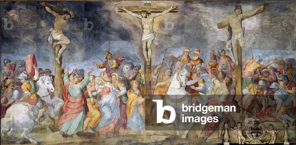 LRI4695712 The Crucifixion Inri (I.N.R.I.) inscription on the cross. On the sides, representation of the good thief (also called Saint Dismas (or Dysmas, Dimas, Dumas) and the bad thief (Gesmas or Gestas), two thieves crucified with Jesus Christ. Fresco by Giovanni Battista Ricci (1537-1627) 1613 Rome, Chiesa di San Marcello al Corso, Italy