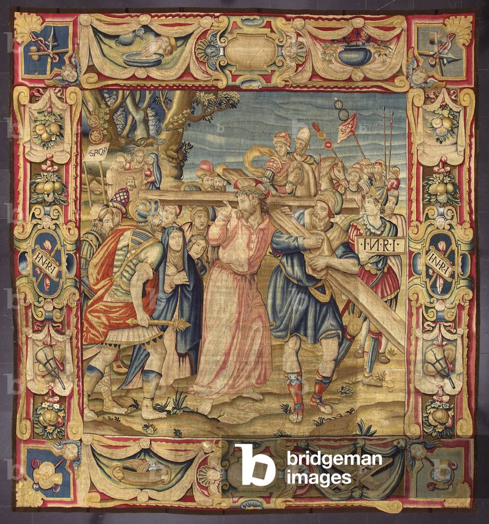 LRI4705280 Christ and Simon of Cyrene (the Cyrenean). (Fifth stop of the Way of the Cross (carrying the cross). A piece of the cross bears the inscription I.N.R.I. (INRI). Tapestry made in the manufactures of Brussels. 16th century Genes, Musei di Strada Nuova