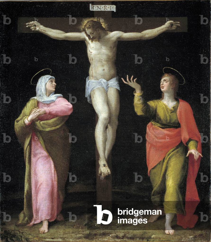 MPH5031648 Crucifixion with Saint Mary and Saint Madeleine. Inscription “” INRI”” on the cross. Painting by Bartolomeo Cesi (1556-1629) 16th century. Private collection Bologna